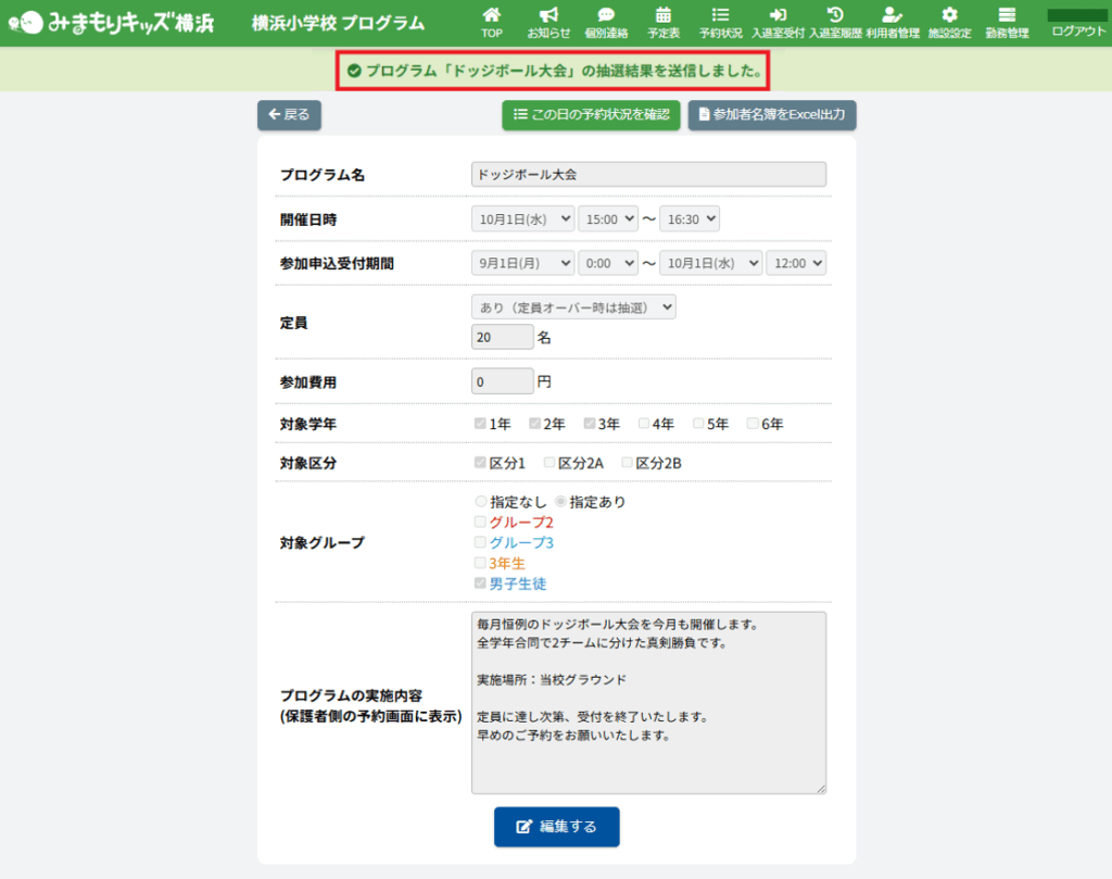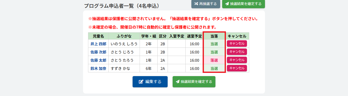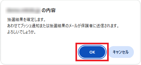 抽選完了後、問題がなければ抽選結果を確定し、保護者へ送信してください。