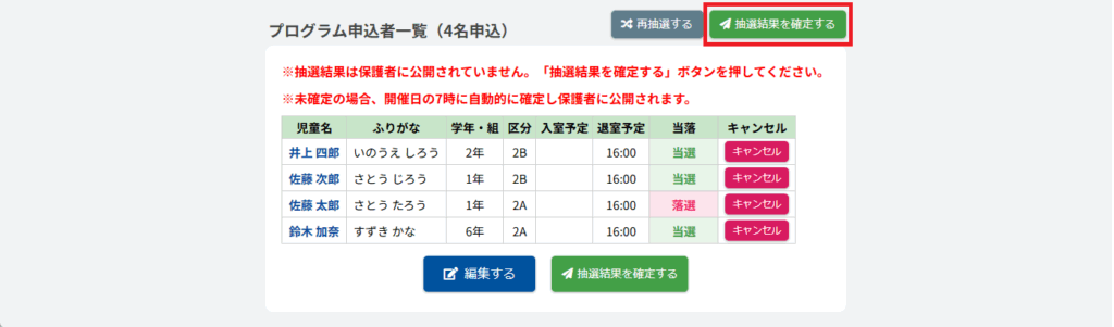 1.プログラム参加予定者一覧の右上にある【抽選結果を確定する】ボタンを押すことで抽選結果の送信が行われます。