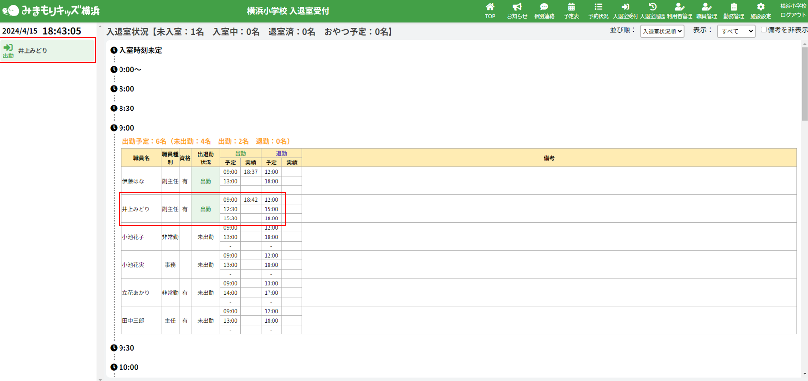 画面左側に「出勤」という表記とともに職員の氏名が表示されます。