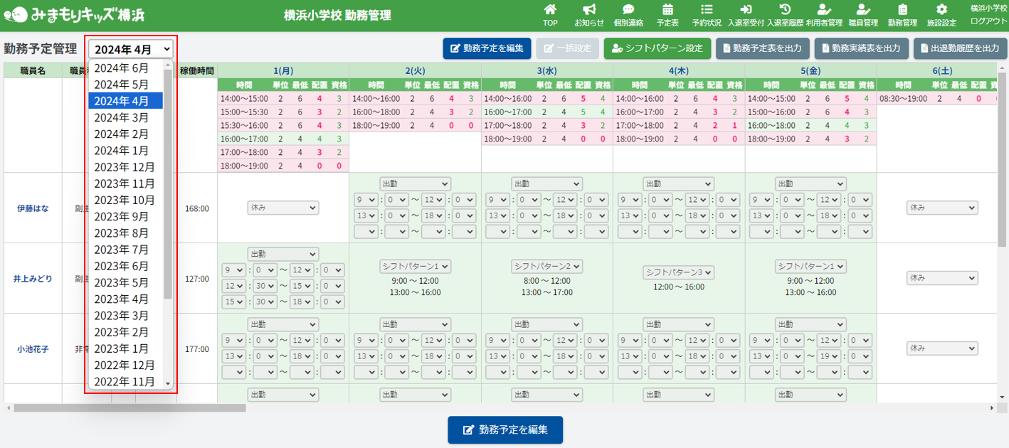 1.日付別勤務管理を確認したい月を選択する