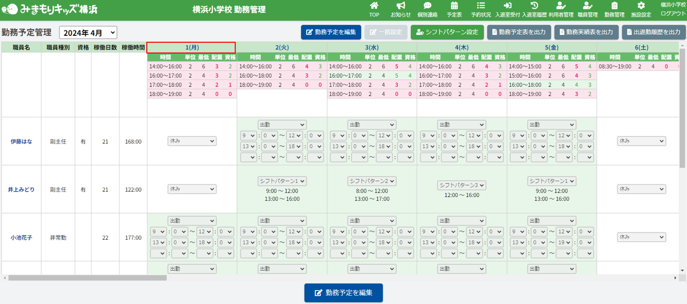 時間帯ごとの職員配置予定人数が職員最低配置基準を満たしている場合は緑文字、満たしていない場合は赤文字となります。