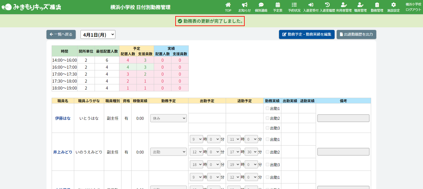 その日の職員配置予定人数が記載されています。