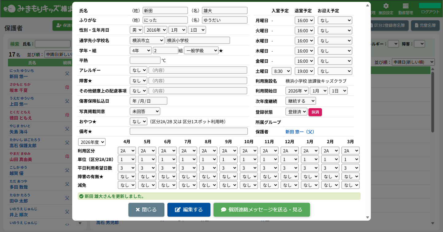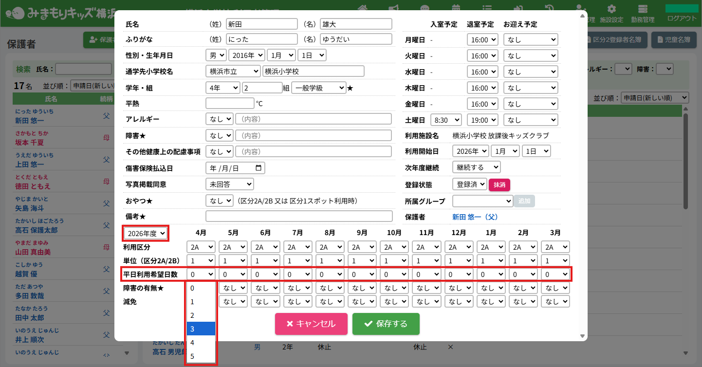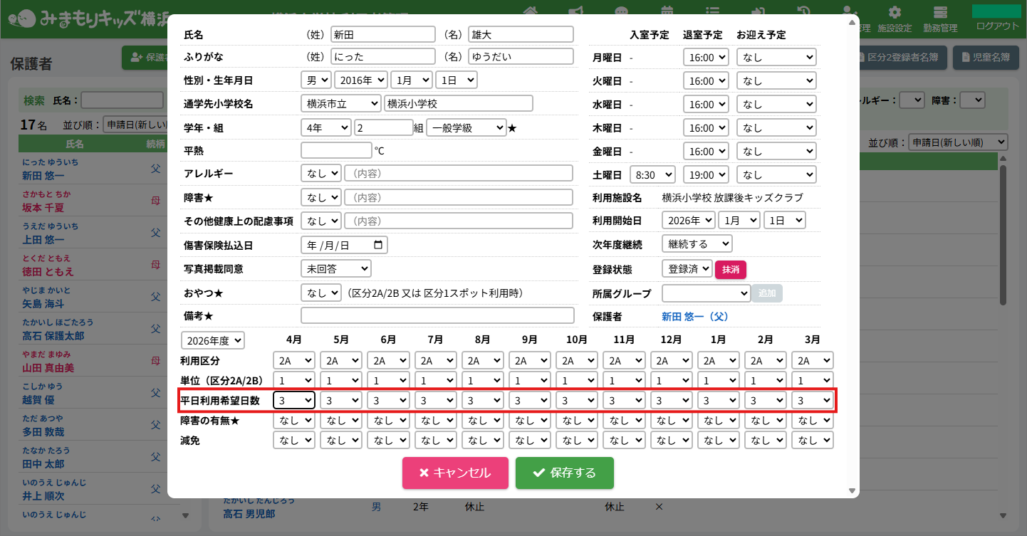 HOME > 利用者管理 > 平日利用希望曜日数を変更する 平日利用希望曜日数を変更する 児童の平日利用希望曜日数を変更する方法を確認できます。 児童の登録時に入力した平日の利用希望が平日利用希望曜日数として登録されますが、後から手動で変更することもできます。 ※対象児童数の計算や支援の単位の自動設定に関わります。ご注意ください。 1.児童詳細を開く 児童の一覧から平日利用希望曜日数を変更したい児童氏名をクリックしてください。 2.児童の登録内容の編集を実行する 【編集する】ボタンをクリックして、次へ進みます。 3.平日利用希望曜日数を変更する 平日利用希望日数欄の項目に沿って変更したい内容を選択してください。 年度と月を選択し変更することができます。変更した月とそれ以降の月に設定が適用されます。 例:4月の平日利用希望日数を3日にした場合、5月以降も3日になります。 4.変更を保存する 【保存する】ボタンをクリックして、次へ進みます。 5.変更の完了 【閉じる】ボタンをクリックして、平日利用希望曜日数の変更は完了です。 ≪ 支援の単位を設定する 児童の利用を休止する ≫