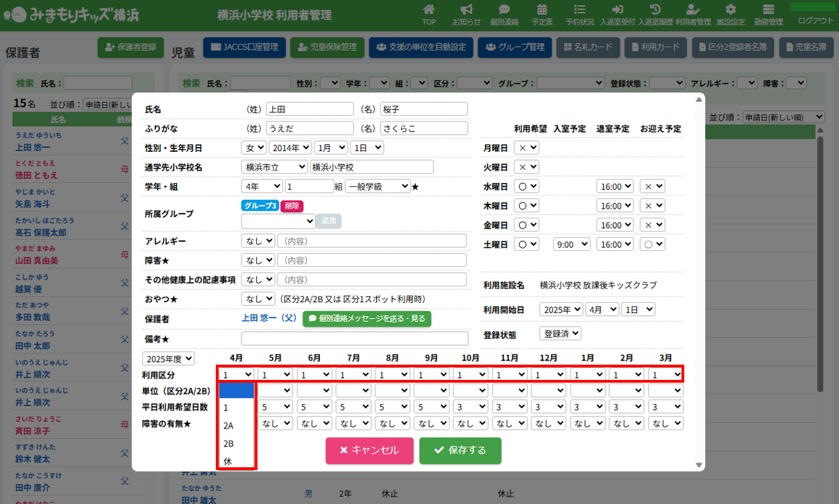 ※「すくすく(ゆうやけ)【区分2A】」と「すくすく(ほしぞら)【区分2B】」の児童は、「支援の単位」が割り振られている必要があります。詳細については下記のリンクをクリックしてご確認ください。