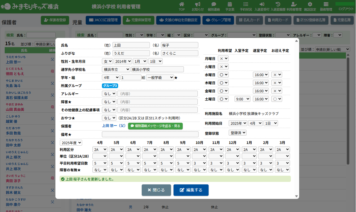 児童の一覧から利用区分を変更したい児童氏名をクリックしてください。