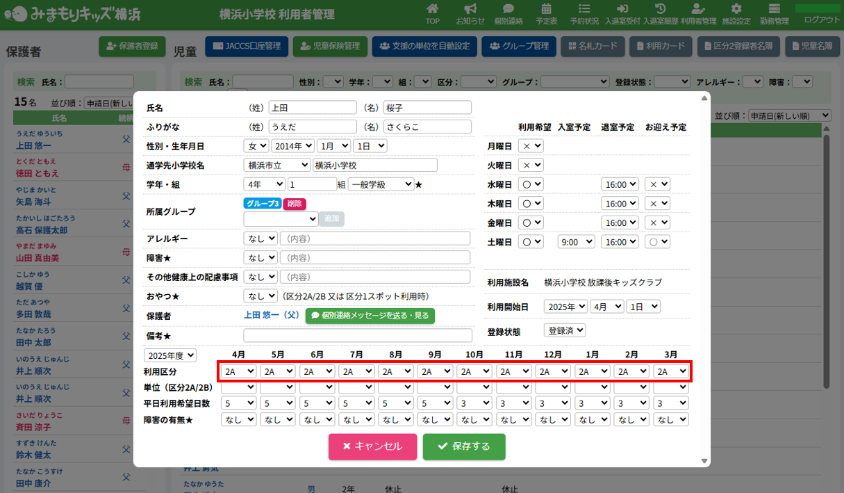 1月の利用区分を2Bに変更した場合、2月、3月も2Bに変更されます。
