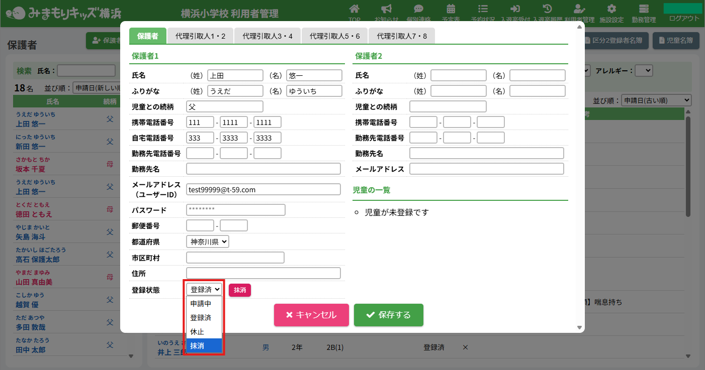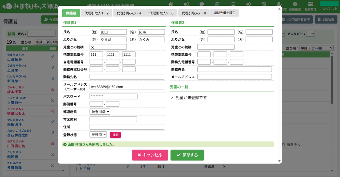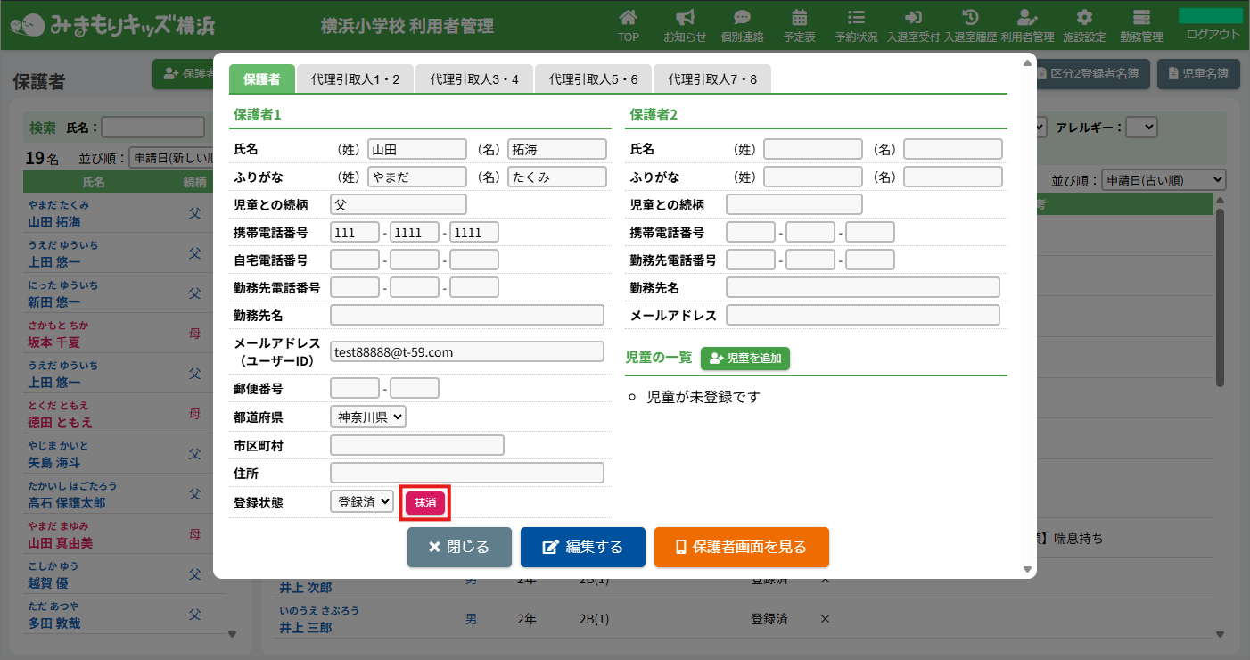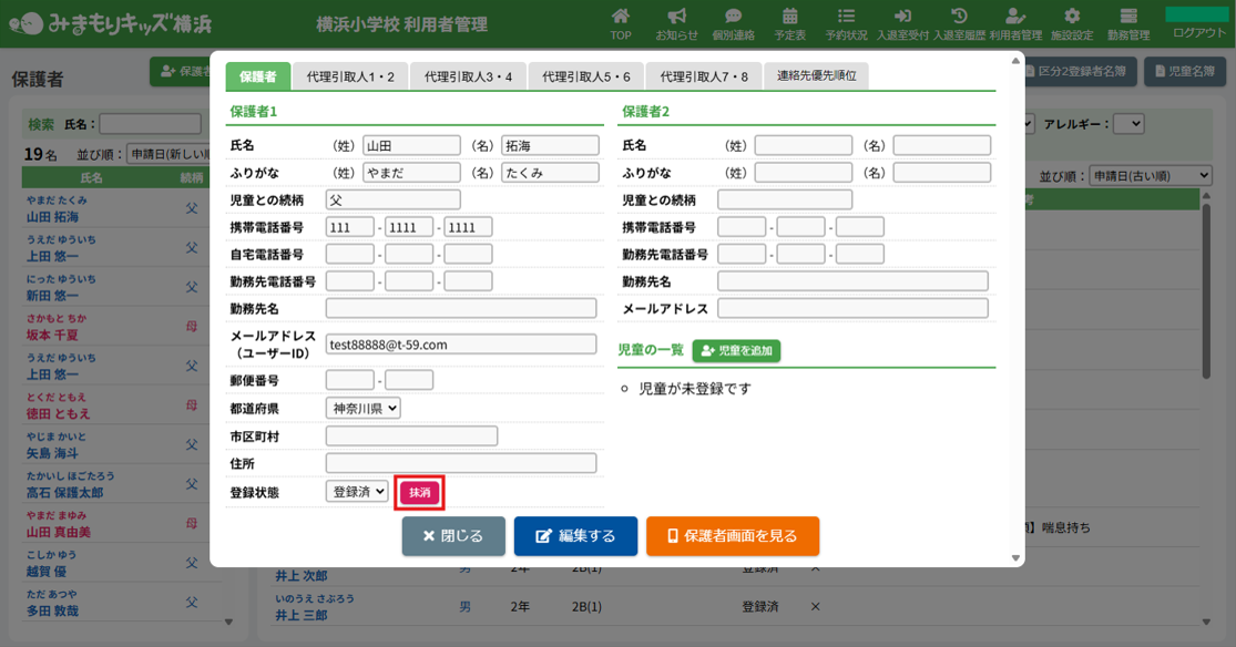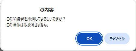 HOME > 利用者管理 > 保護者の登録を抹消する 保護者の登録を抹消する 「抹消」とは… 保護者が誤って登録してしまった場合などに施設側がデータを消去することです。 抹消された保護者は表示されなくなります。また、抹消された保護者はログインができなくなります。 ここでは、保護者の登録状態を抹消にする機能の確認ができます。 入退室実績がある児童を持つ保護者の利用を止める場合は「休止」をお選びください。 (詳しくは下記の【保護者の利用を休止する】をクリックしてご確認ください。) 保護者の利用を休止する ≫ 保護者の抹消を行う場合、該当保護者に紐づいた児童が登録されていない(=抹消されている)ことが条件となります。事前に児童の登録が抹消されているかをご確認ください。(詳しくは下記の【児童の登録を抹消する】をクリックしてご確認ください。) 児童の登録を抹消する ≫ 1.保護者編集フォームを開く 登録を抹消したい保護者の氏名をクリックしてください。 2.保護者の抹消を実行する 登録状態欄の【抹消】ボタンをクリックして下さい。 3.アラートを確認する 画面上部にアラートが表示され、【OK】を押すと抹消が実行されます。 ※抹消された保護者のデータは復元できません。ご注意ください。 4.保護者の抹消を完了する 保護者の抹消が完了した旨のメッセージが表示されます。【閉じる】ボタンをクリックして手順は完了です。 5.保護者の抹消を確認する 保護者一覧から、先ほど抹消した保護者のデータが消去されていることを確認してください。 <編集画面から抹消する場合> 保護者情報の編集画面からも抹消を実行することができます。登録状態欄の選択肢から「抹消」を選択して【保存する】をクリックして下さい、同様に抹消が実行されます。 ≪ 保護者の利用を再開する 特定の保護者画面を表示する ≫