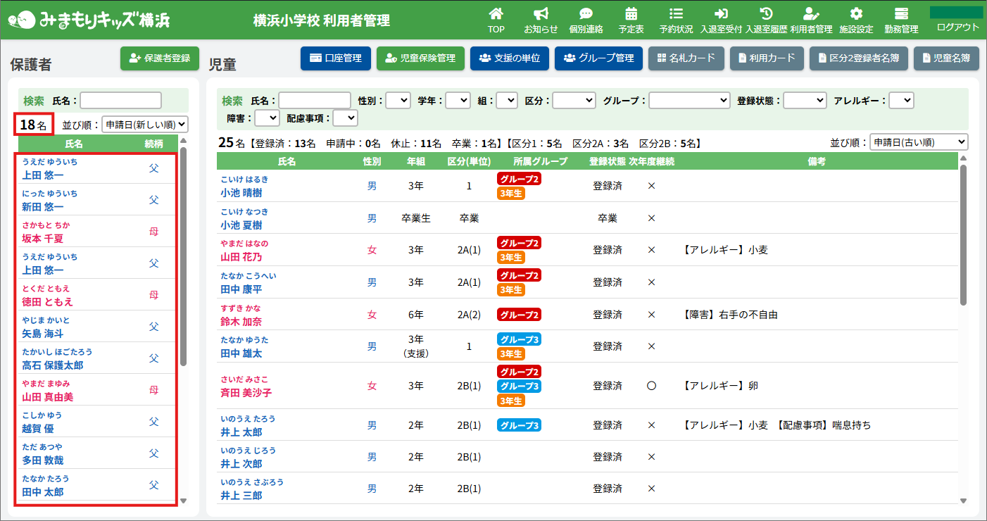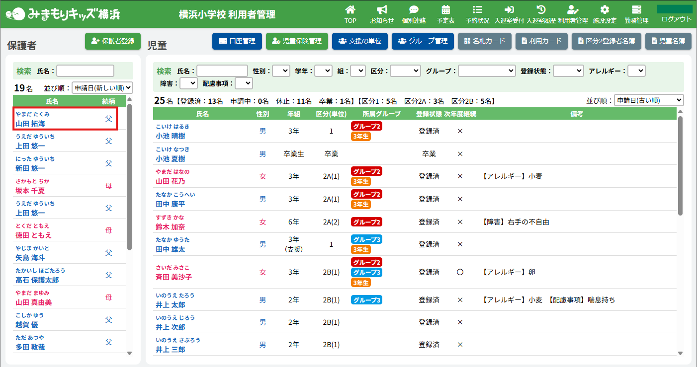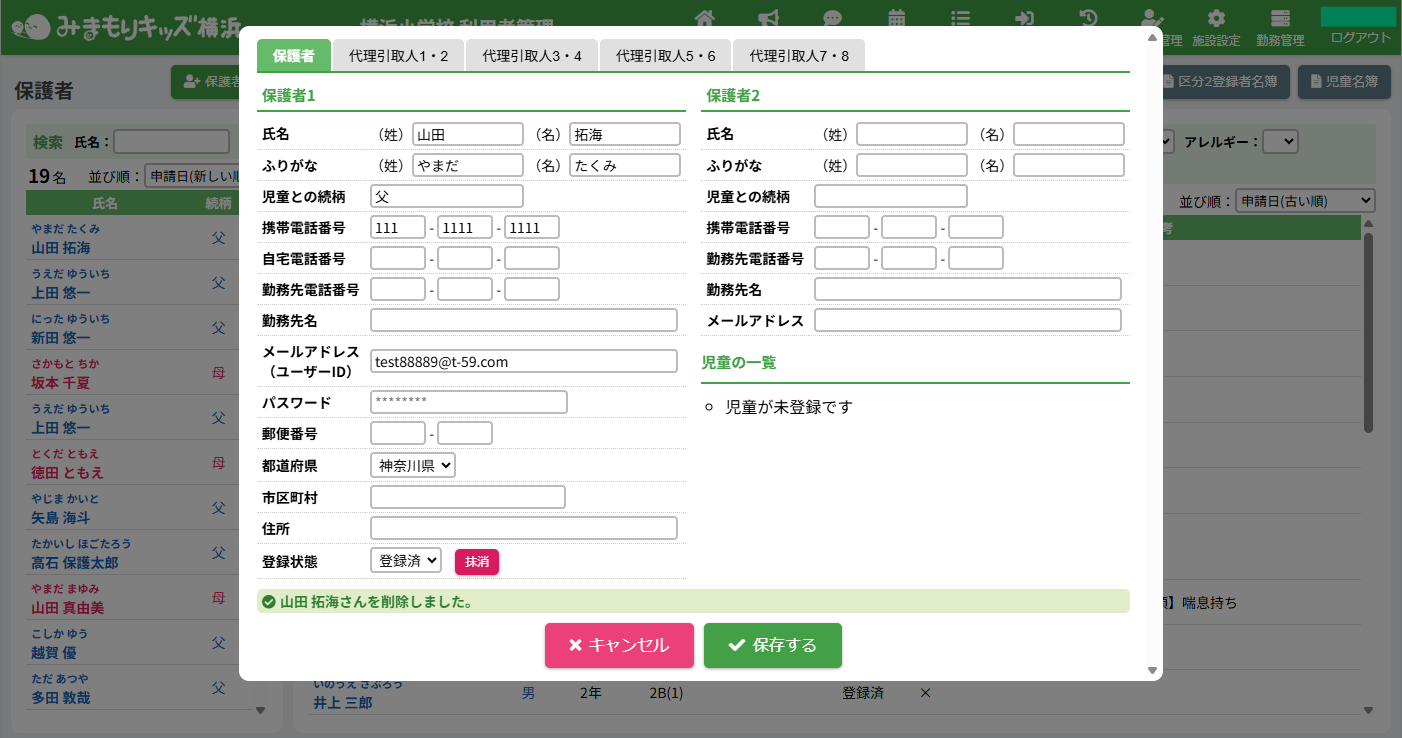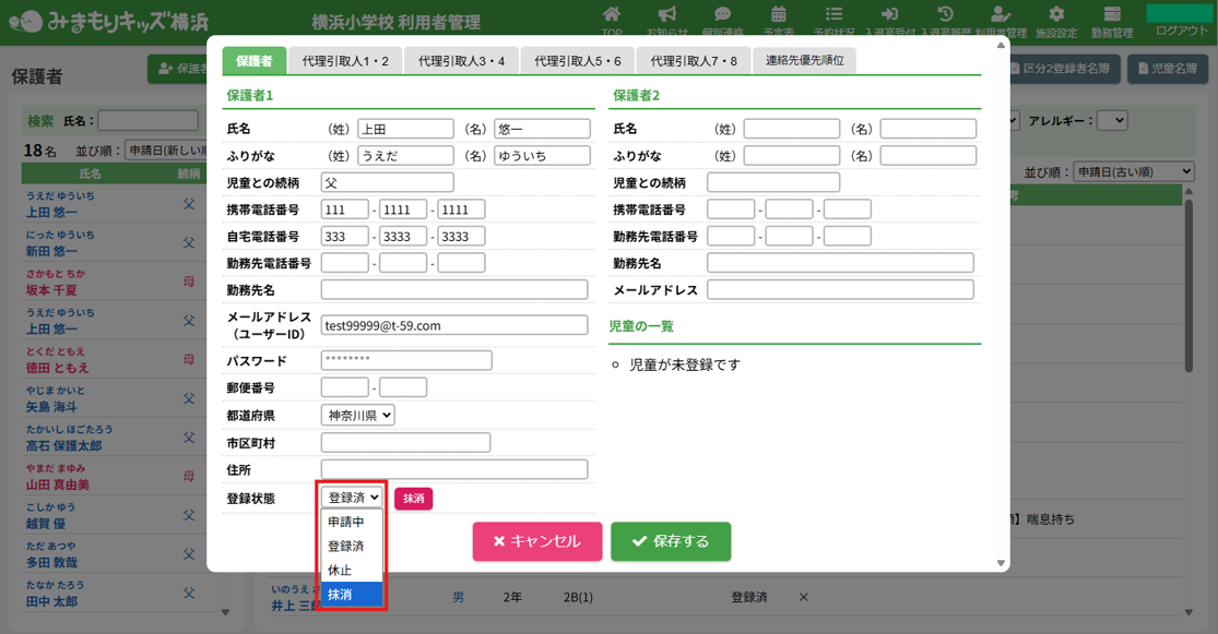 HOME > 利用者管理 > 保護者の登録を抹消する 保護者の登録を抹消する 「抹消」とは… 保護者が誤って登録してしまった場合などに施設側がデータを消去することです。 抹消された保護者は表示されなくなります。また、抹消された保護者はログインができなくなります。 ここでは、保護者の登録状態を抹消にする機能の確認ができます。 入退室実績がある児童を持つ保護者の利用を止める場合は「休止」をお選びください。 (詳しくは下記の【保護者の利用を休止する】をクリックしてご確認ください。) 保護者の利用を休止する ≫ 保護者の抹消を行う場合、該当保護者に紐づいた児童が登録されていない(=抹消されている)ことが条件となります。事前に児童の登録が抹消されているかをご確認ください。(詳しくは下記の【児童の登録を抹消する】をクリックしてご確認ください。) 児童の登録を抹消する ≫ 1.保護者編集フォームを開く 登録を抹消したい保護者の氏名をクリックしてください。 2.保護者の抹消を実行する 登録状態欄の【抹消】ボタンをクリックして下さい。 3.アラートを確認する 画面上部にアラートが表示され、【OK】を押すと抹消が実行されます。 ※抹消された保護者のデータは復元できません。ご注意ください。 4.保護者の抹消を完了する 保護者の抹消が完了した旨のメッセージが表示されます。【閉じる】ボタンをクリックして手順は完了です。 5.保護者の抹消を確認する 保護者一覧から、先ほど抹消した保護者のデータが消去されていることを確認してください。 <編集画面から抹消する場合> 保護者情報の編集画面からも抹消を実行することができます。登録状態欄の選択肢から「抹消」を選択して【保存する】をクリックして下さい、同様に抹消が実行されます。 ≪ 保護者の利用を再開する 特定の保護者画面を表示する ≫