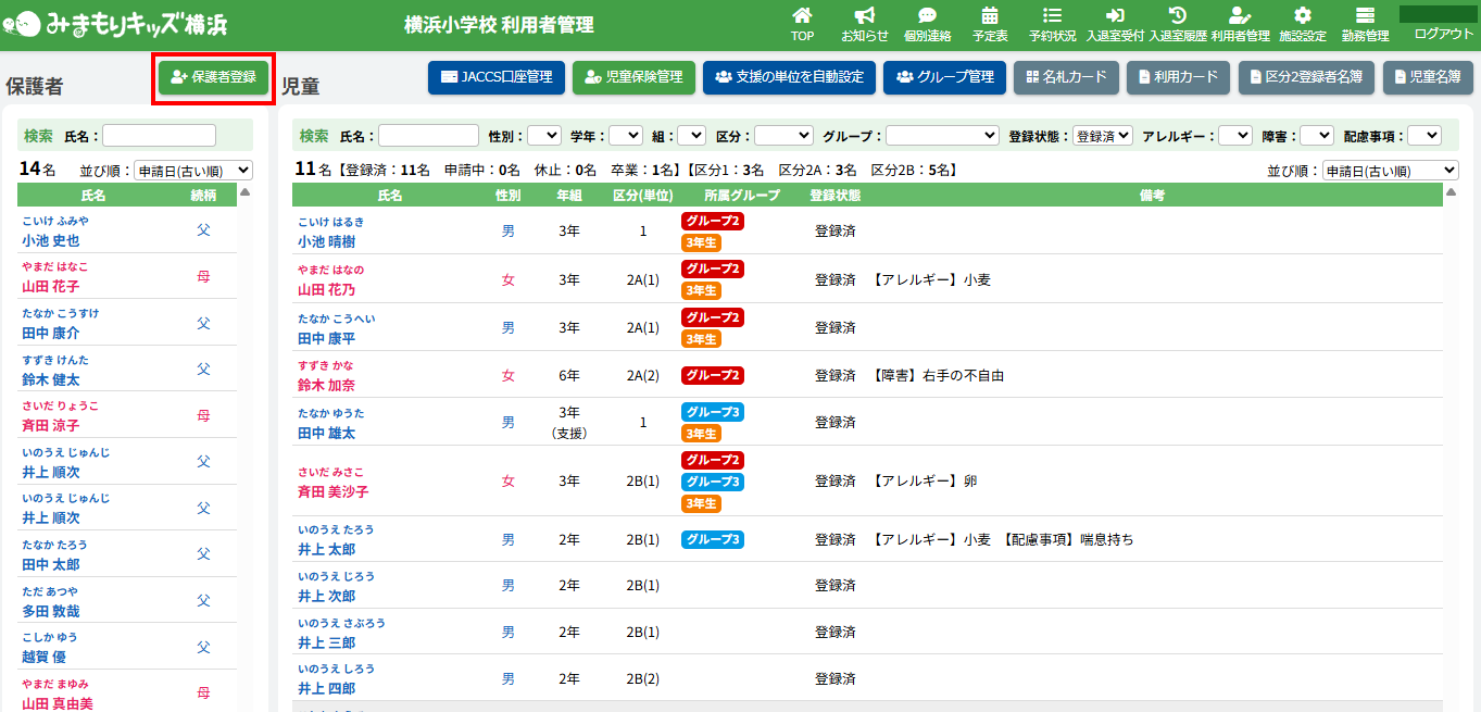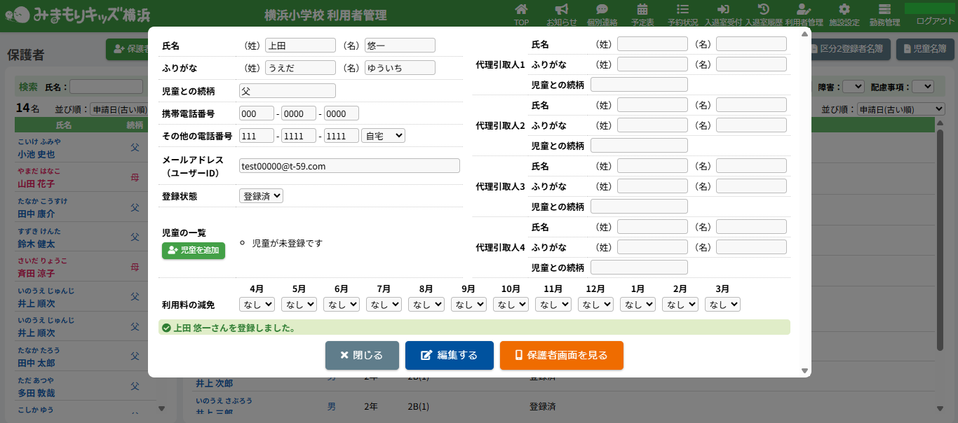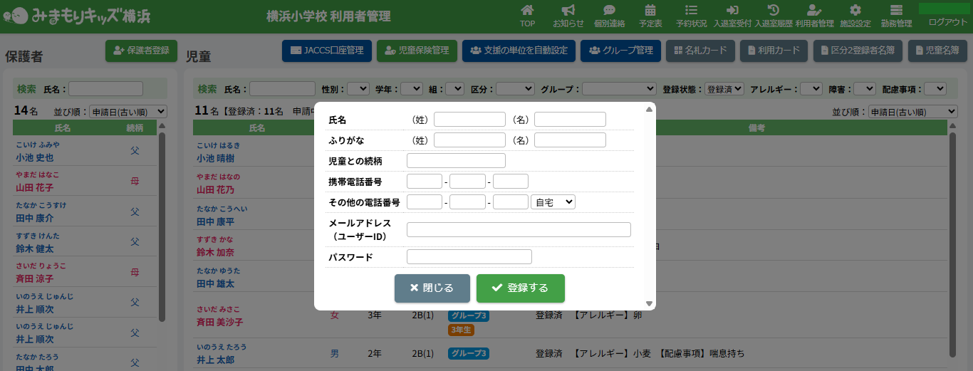 HOME > 利用者管理 > 保護者を登録する 保護者を登録する 「利用者管理」とは…保護者や児童の基本情報を確認・編集する機能です。 ※施設側から保護者を登録した場合は「登録状態」が「登録済」になります。 1.保護者登録フォームを開く 利用者管理画面の左上にある【保護者登録】ボタンをクリックしてください。 2.登録内容の入力 保護者新規登録画面が表示されます。 各項目に沿って登録内容の入力、選択をしてください。 3.保護者登録を実行する 【登録する】ボタンをクリックして、次へ進みます。 4.保護者登録完了 【閉じる】ボタンをクリックして保護者の新規登録は完了です。 ※施設側から保護者を登録した場合は「登録状態」が「登録済」になります。 児童の登録や代理引取人の登録、利用料の減免を設定できます。 詳しくは下記のリンクをクリックしてご確認ください。 児童を登録する ≫ 代理引取人を登録・変更する ≫ 利用料の減免を設定する ≫ ≪ 保護者、児童の並び替えを行う 保護者の登録内容を変更する ≫