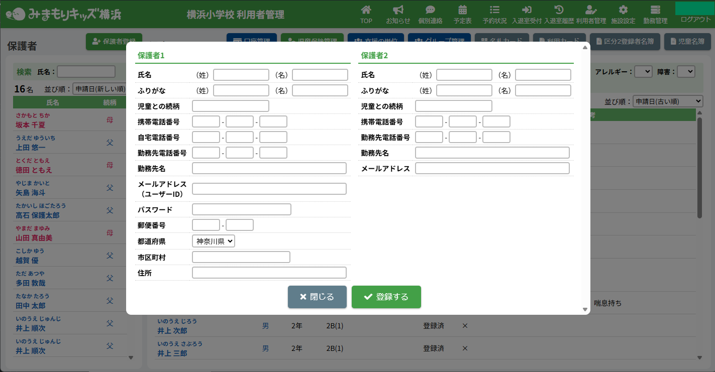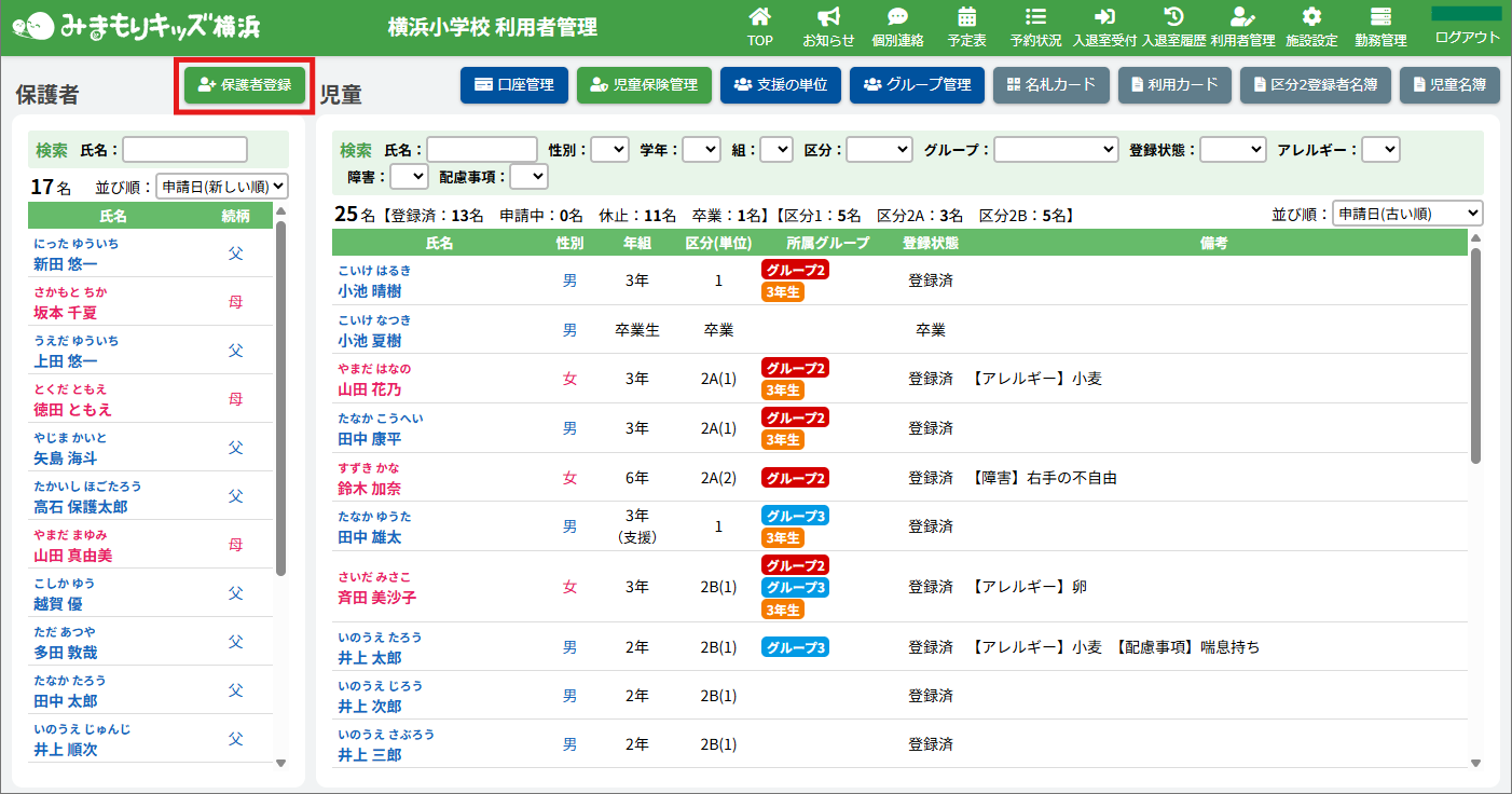 利用者管理画面の左上にある【保護者登録】ボタンをクリックしてください。
