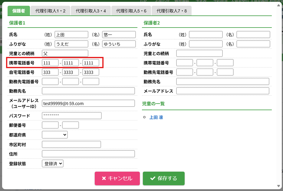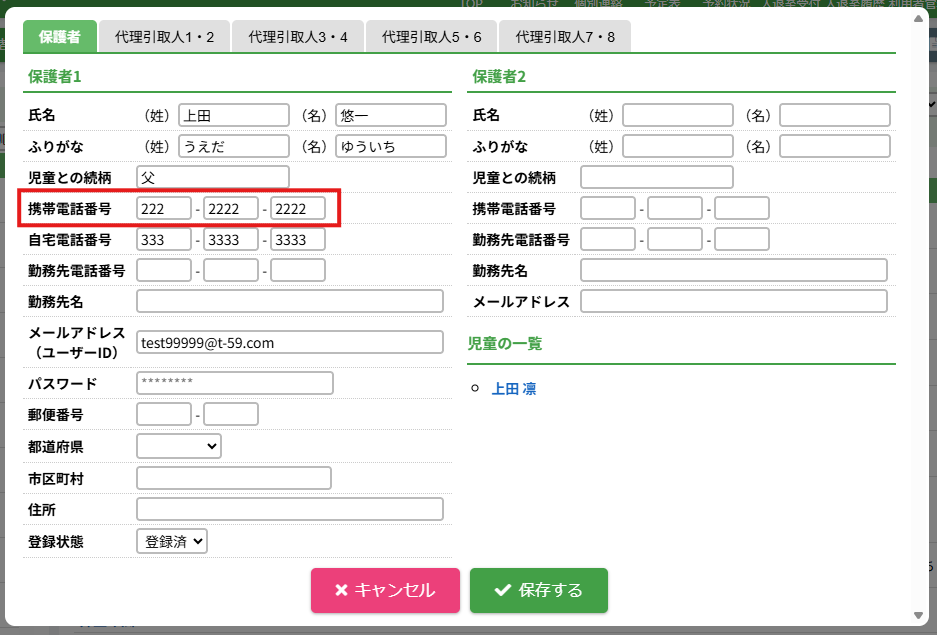 保護者のユーザーIDやパスワードの変更、代理引取人の登録、利用料の減免等を設定できます。