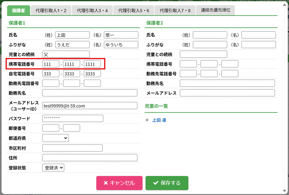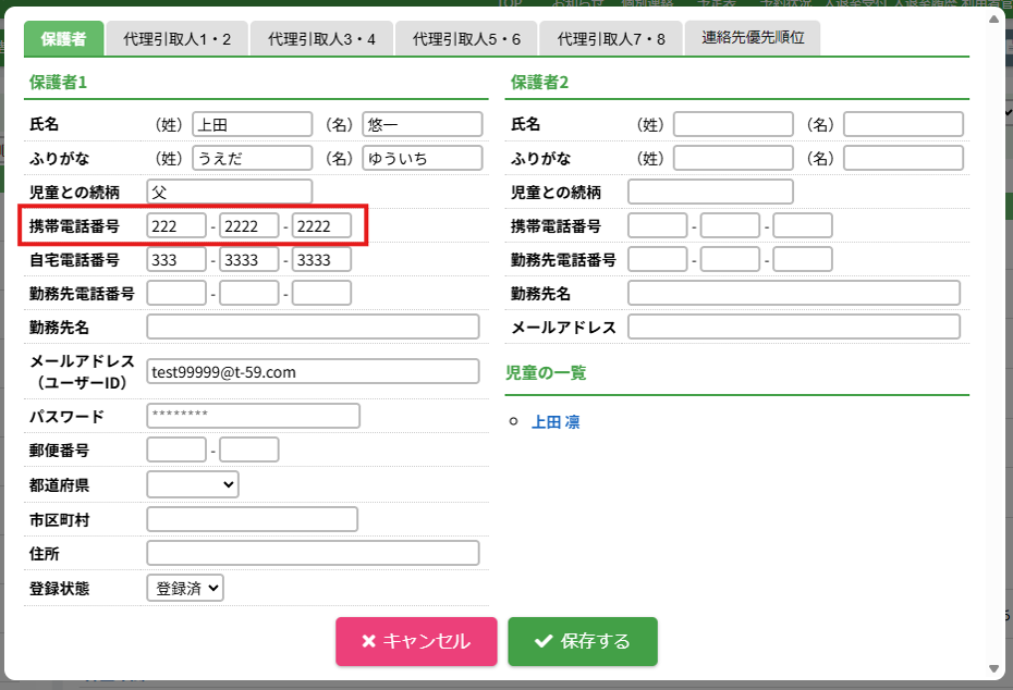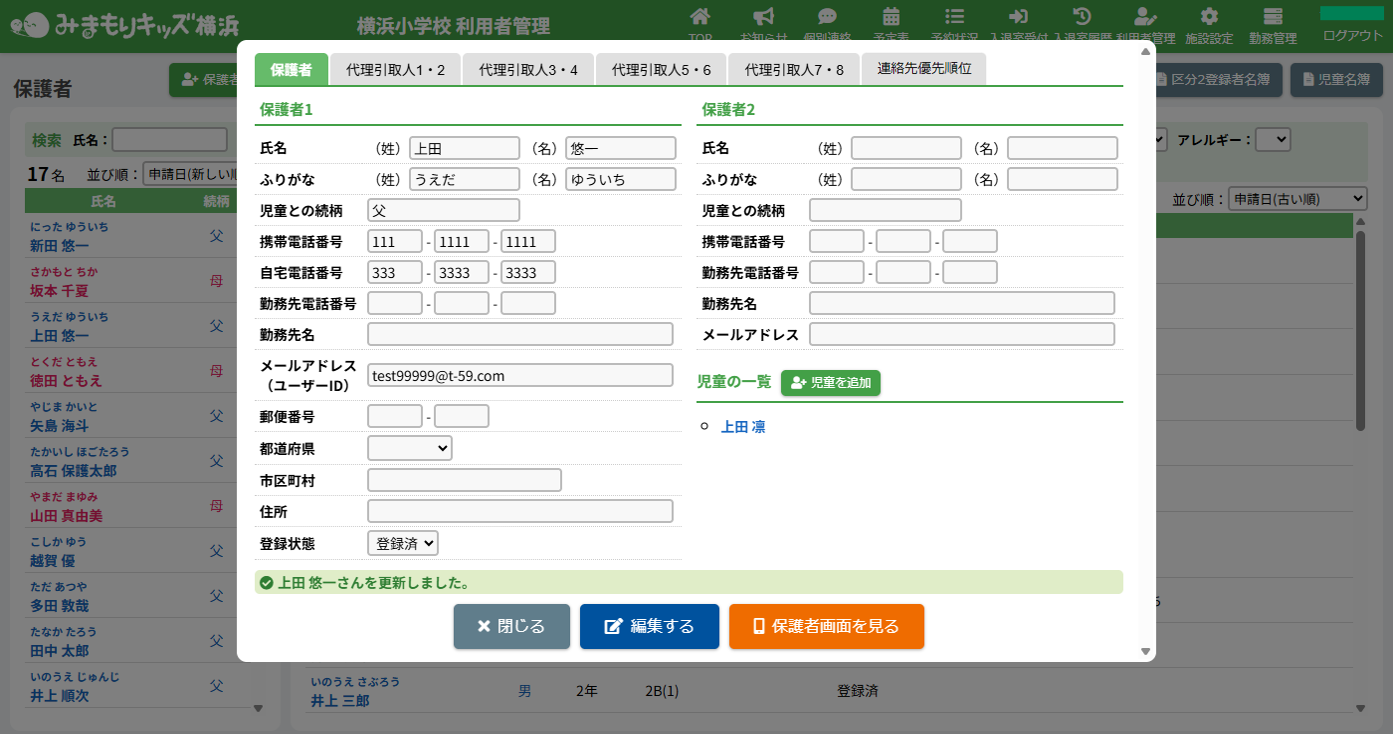 HOME > 利用者管理 > 保護者の登録内容を変更する 保護者の登録内容を変更する 1.保護者編集フォームを開く 登録内容を変更したい保護者氏名をクリックしてください。 2.保護者の登録内容の編集を実行する 【編集する】ボタンをクリックして、次へ進みます。 3.登録内容を変更する 各項目に沿って変更したい内容を入力、選択してください。 4.登録内容の編集を保存する 【保存する】ボタンをクリックして、次へ進みます。 5.保護者の編集を完了する 【閉じる】ボタンをクリックして、保護者登録内容の変更は完了です。 保護者のユーザーIDやパスワードの変更、代理引取人の登録、利用料の減免等を設定できます。 詳しくは下記のリンクをクリックしてご確認ください。 児童を登録する ≫ 保護者のユーザーIDやパスワードを変更する ≫ 代理引取人を登録・変更する ≫ 利用料の減免を設定する ≫ 保護者の利用を休止する ≫ 保護者の登録を抹消する ≫ ≪ 保護者を登録する 保護者のユーザーIDやパスワードを変更する ≫