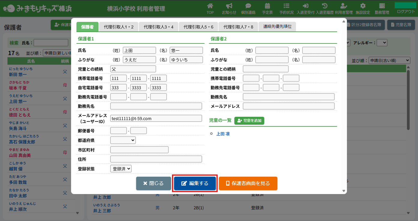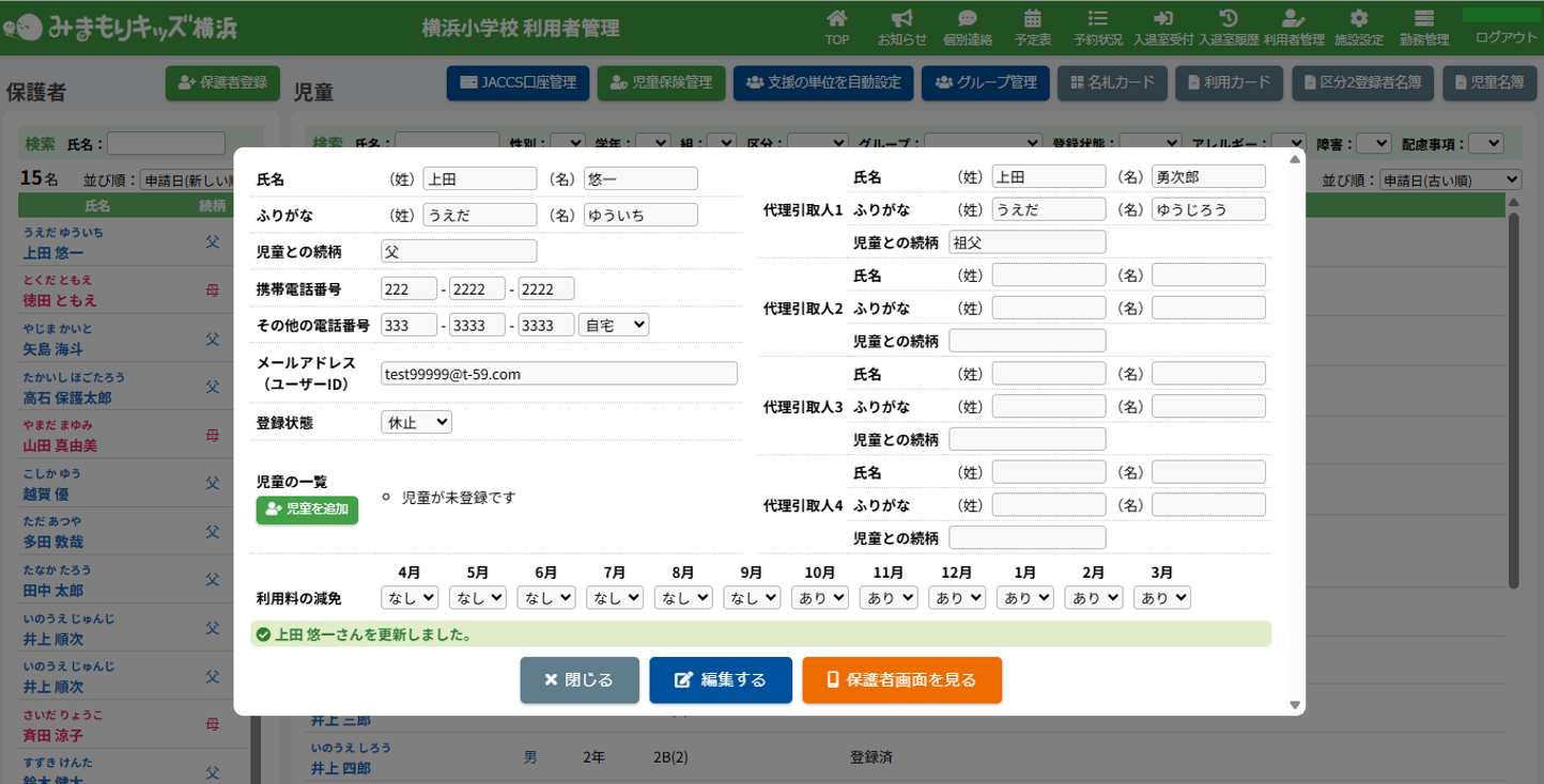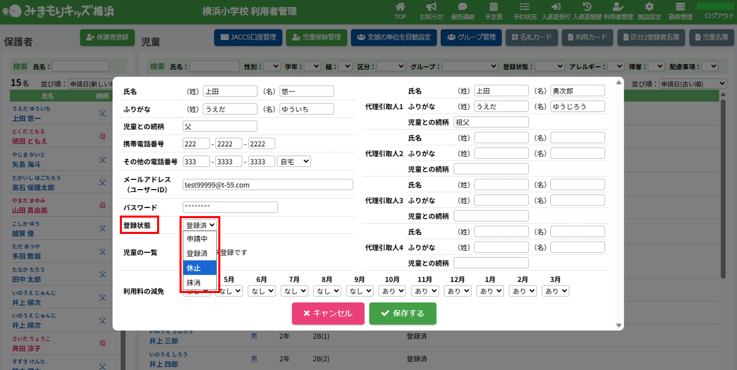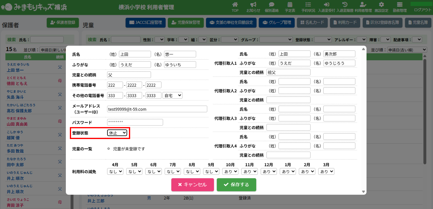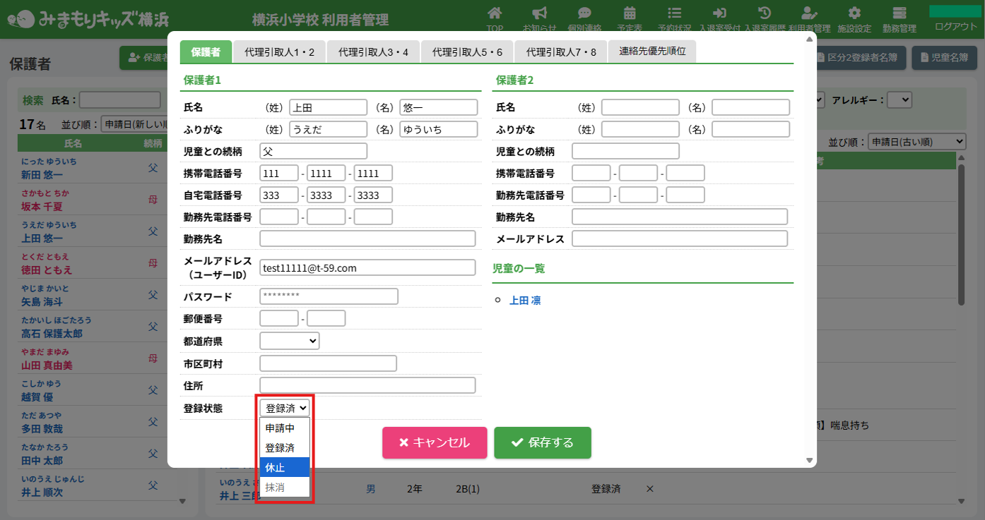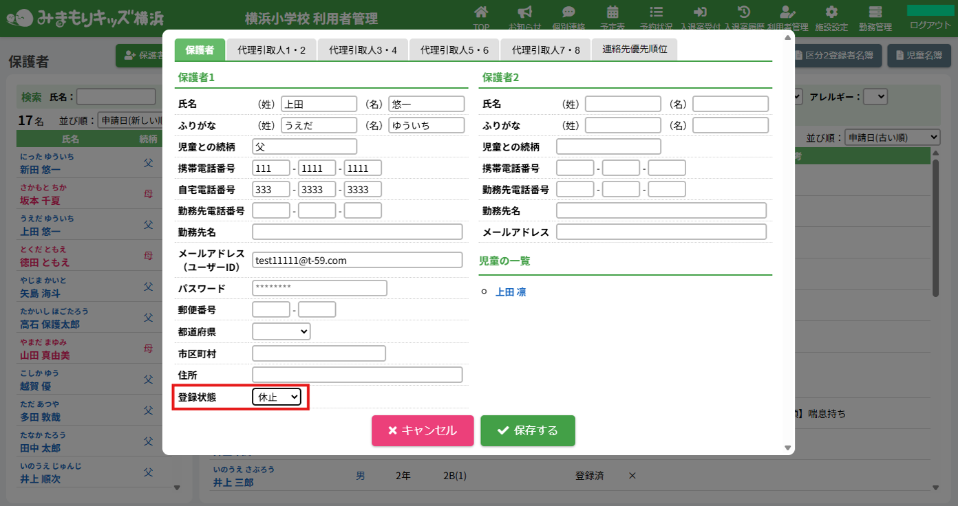 HOME > 利用者管理 > 保護者の利用を休止する 保護者の利用を休止する 「休止」とは… 保護者及び児童が引っ越し、転校した時など利用を終了する場合に使用します。 保護者のメールアドレスの登録が解除されるため、転校先でみまもりキッズを利用する際に同じメールアドレスで登録できます。 過去のデータは削除されませんが、保護者からの予約受付・入退室管理システムが利用できなくなります。 保護者の利用を休止する際は、まずその保護者の全ての児童の利用を休止してください。 (詳しくは下記の【児童の利用を休止する】をクリックしてご確認ください。 児童の利用を休止する ≫ ここでは、保護者の登録状態を休止にする機能の確認ができます。 誤って登録してしまった保護者のデータを削除したい場合は「抹消」をお選びください。 (詳しくは下記の【保護者の登録を抹消する】をクリックしてご確認ください。) 保護者の登録を抹消する ≫ 1.保護者編集フォームを開く 登録内容を変更したい保護者の氏名をクリックしてください。 2.保護者の登録状態を編集する 【編集する】ボタンをクリックして、次へ進みます。 3.登録状態を変更する 登録状態欄の選択肢から「休止」を選択してください。 4.登録状態の変更を保存する 【保存する】ボタンをクリックして、次へ進みます。 5.保護者の登録状態の変更を完了する 登録状態が「登録済」から「休止」になったことを確認してください。 【閉じる】ボタンをクリックしたら、保護者の利用の休止は完了です。 ≪ 利用料の減免を設定する 保護者の利用を再開する ≫