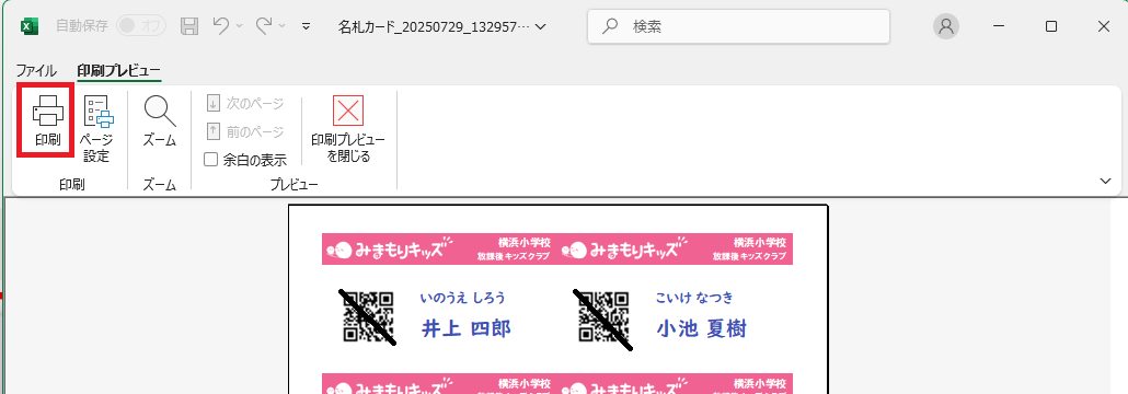 画面上部にある【名札カード出力】ボタンをクリックしてください。