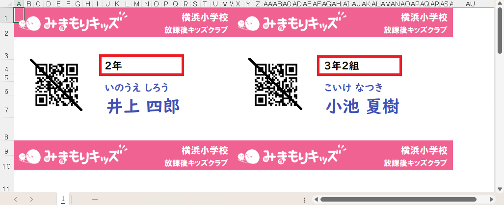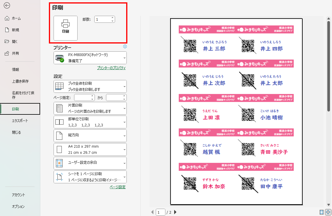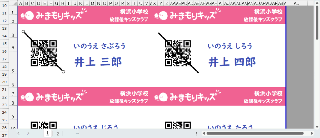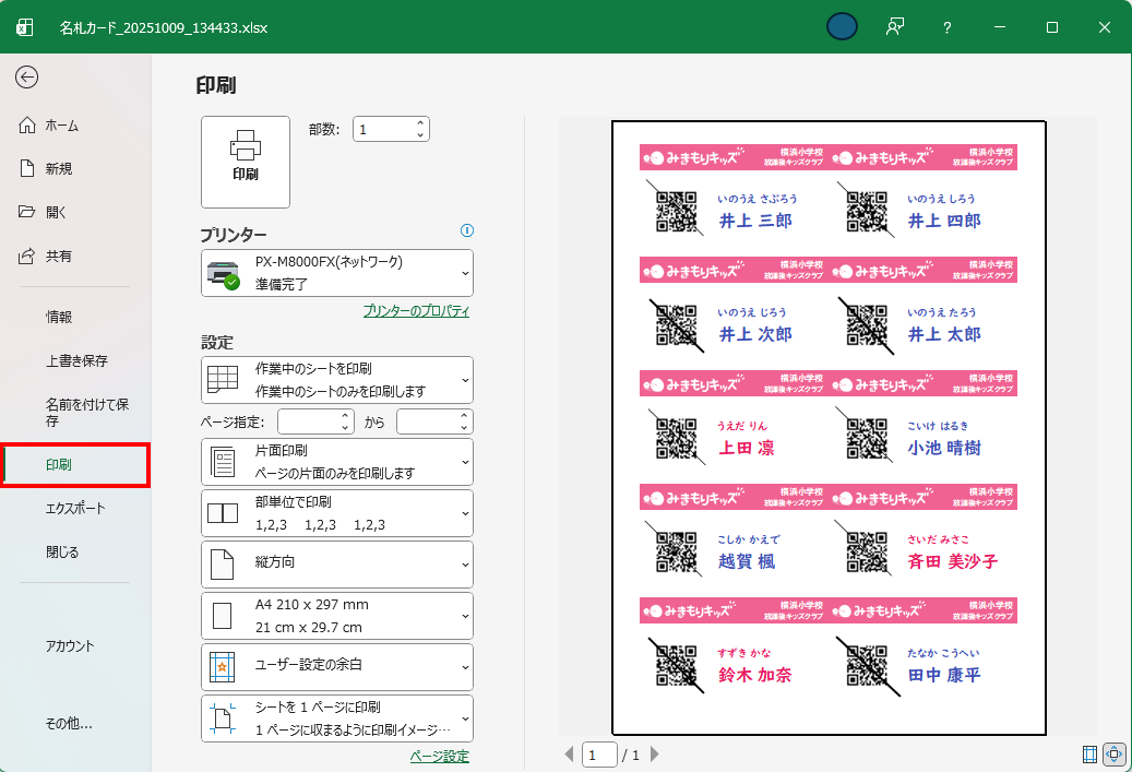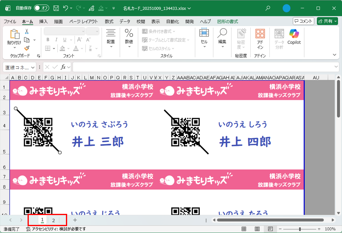 1シートに最大10名の名札カードが出力されます。11名以上の名札カードを出力した場合はシートを切り替えて確認してください。