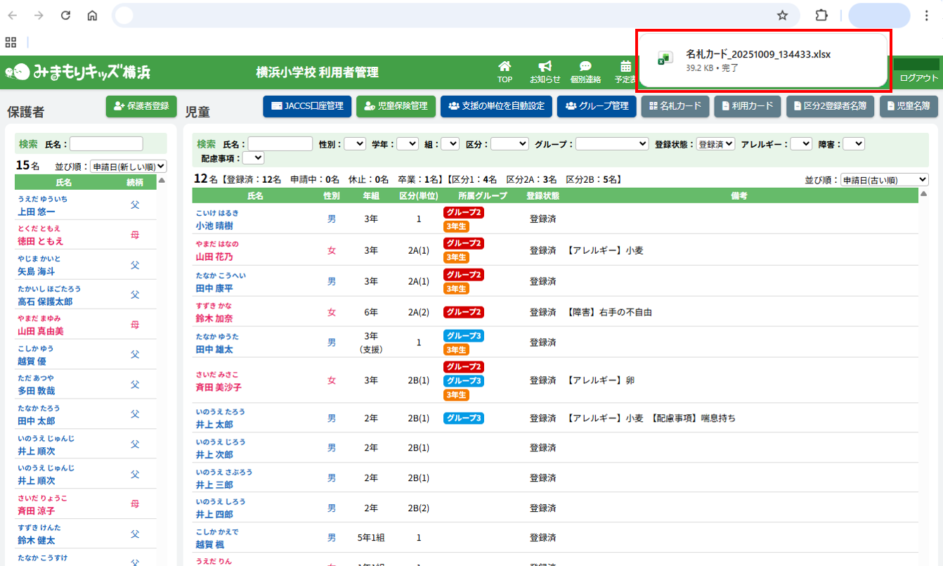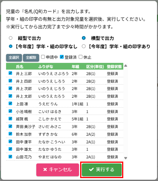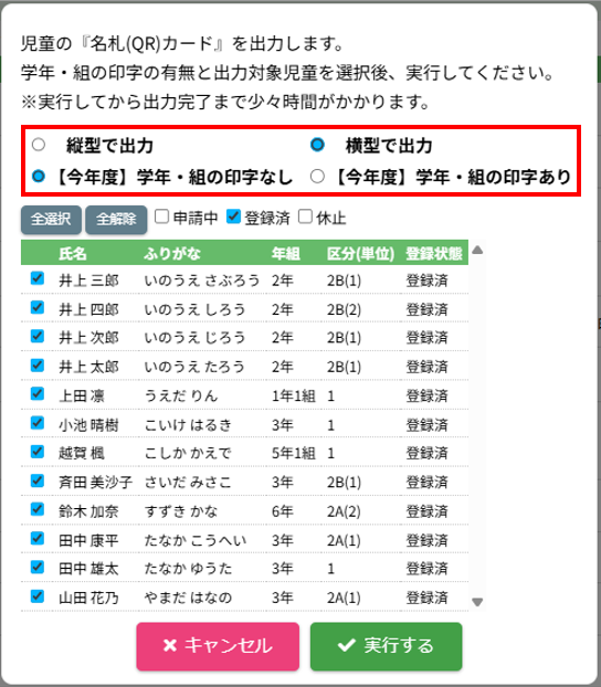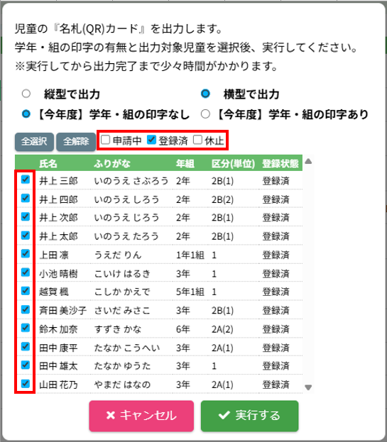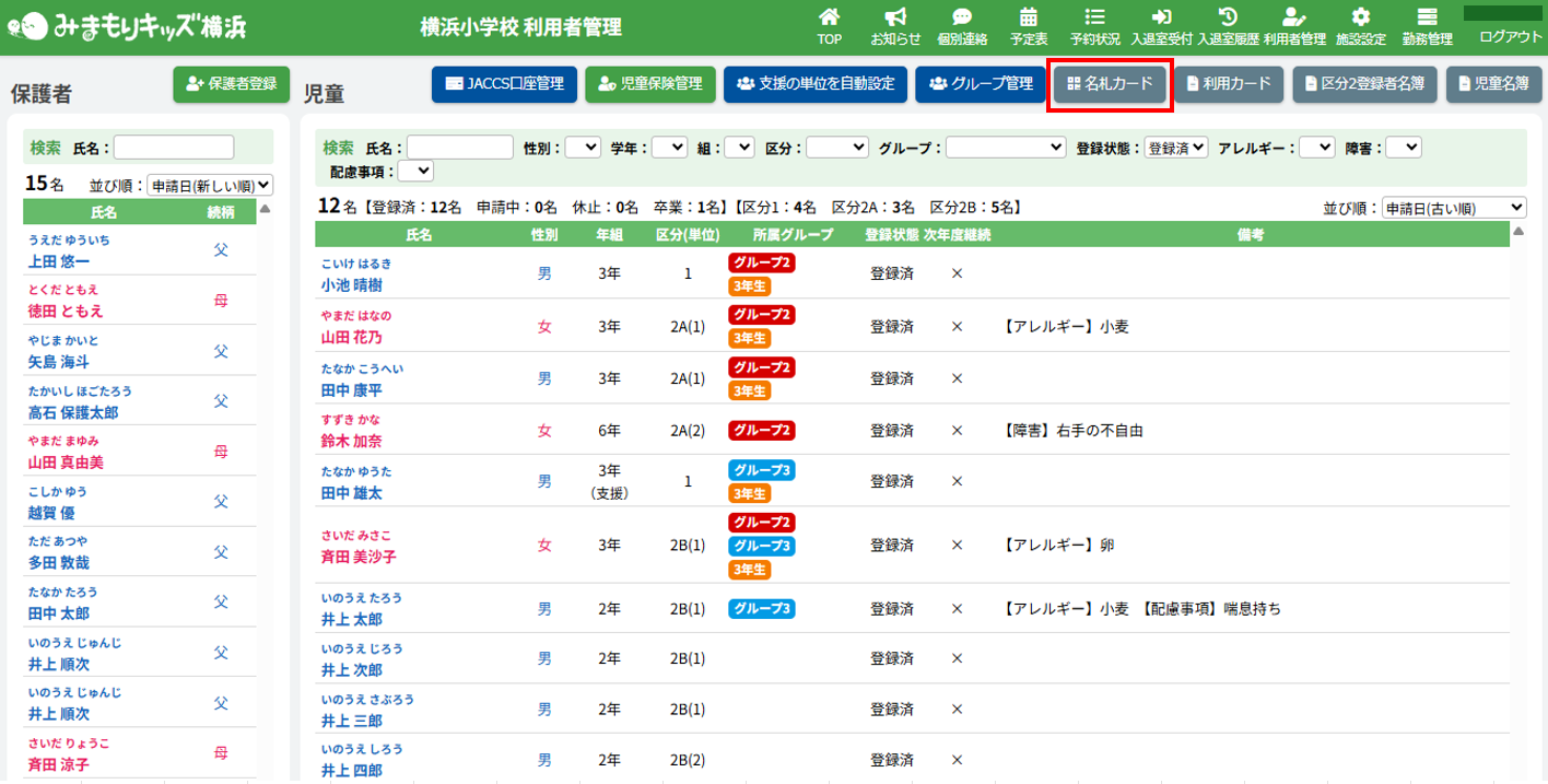また、学年・区分・登録状態といった単位で絞り込む場合、あらかじめ利用者画面上で児童を絞り込んだ状態で「名札カード」ボタンを押してください。