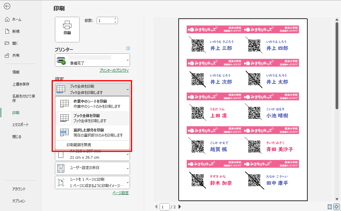 (3)印刷設定より「ブック全体を印刷」を選択してください。必要に応じて用紙サイズやカラー設定なども設定してください。