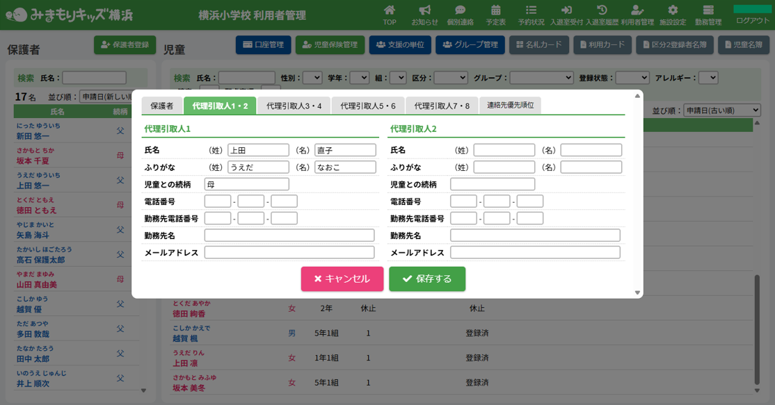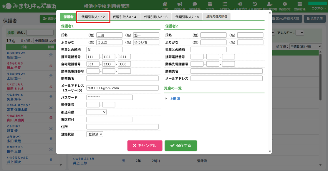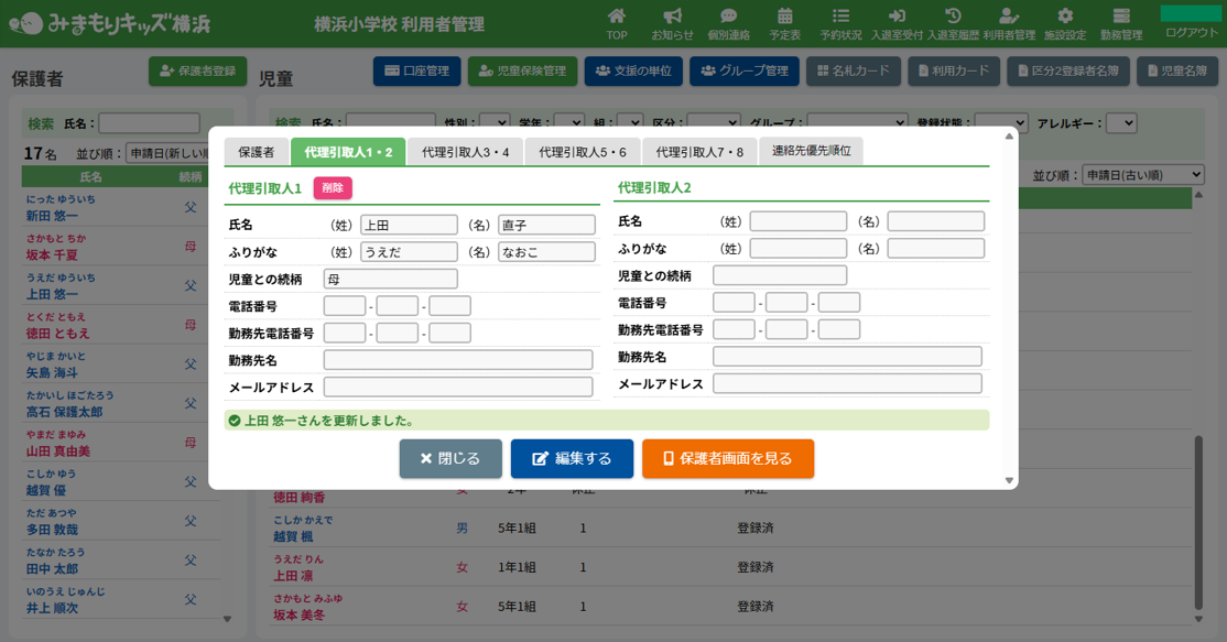 HOME > 利用者管理 > 代理引取人を登録・変更する 代理引取人を登録・変更する 1.保護者編集フォームを開く 代理引取人を登録・変更したい保護者氏名をクリックしてください。 2.保護者の編集を実行する 【編集する】ボタンをクリックして下さい。 3.代理引取人を選択する 【代理取引人】タブをクリックして下さい。 4.編集内容を入力する 項目に沿って登録・変更したい内容を入力してください。 5.代理引取人の編集を保存する 【保存する】ボタンをクリックして、次へ進みます。 6.代理引取人の編集を完了する 【閉じる】ボタンをクリックして、代理引取人の登録・変更は完了です。 削除したい場合は代理引取人のタブを表示し【削除】をクリックしてください。 ≪ 保護者のユーザーIDやパスワードを変更する 連絡先優先順位を登録・変更する ≫
