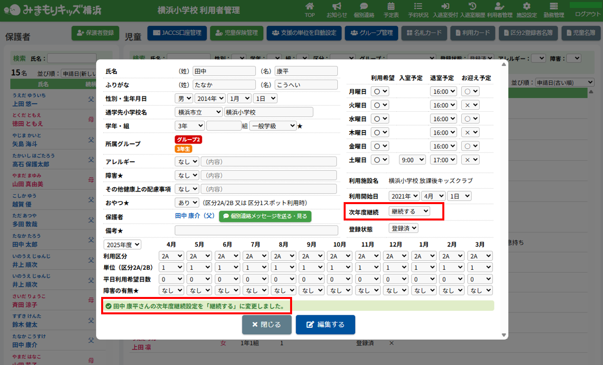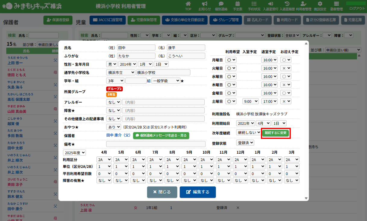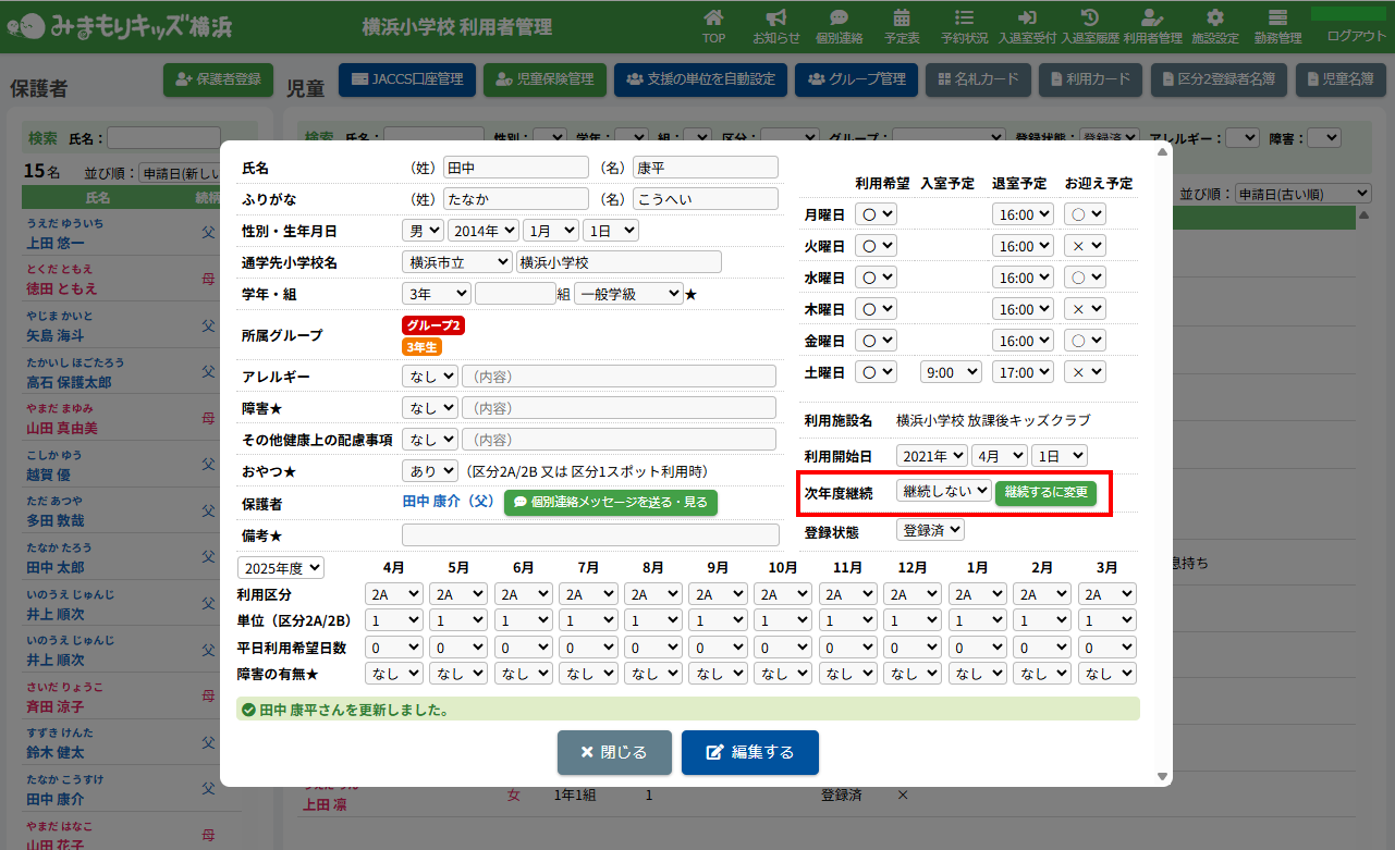 「継続する」に設定された児童は4月1日以降も継続して利用ができます。