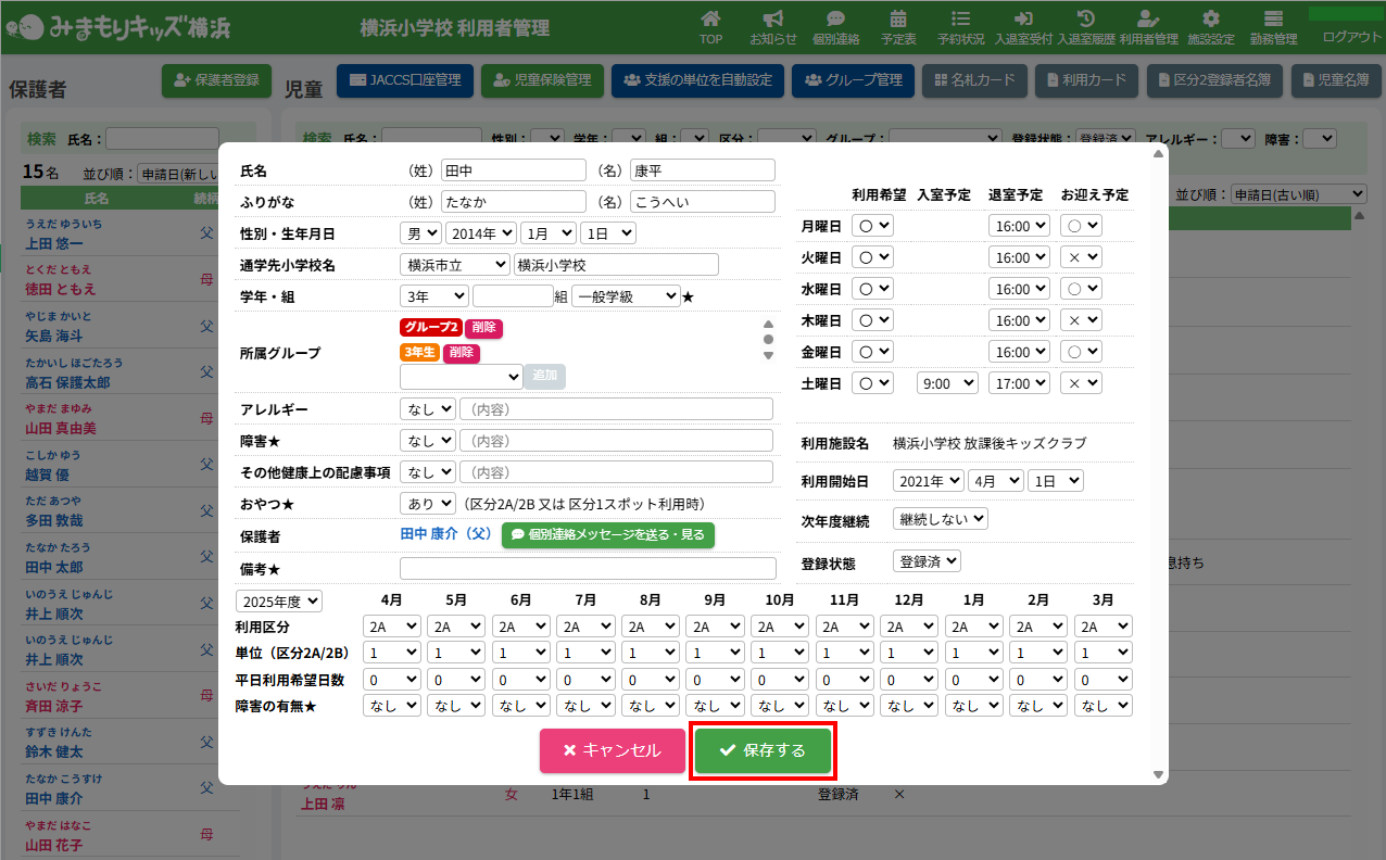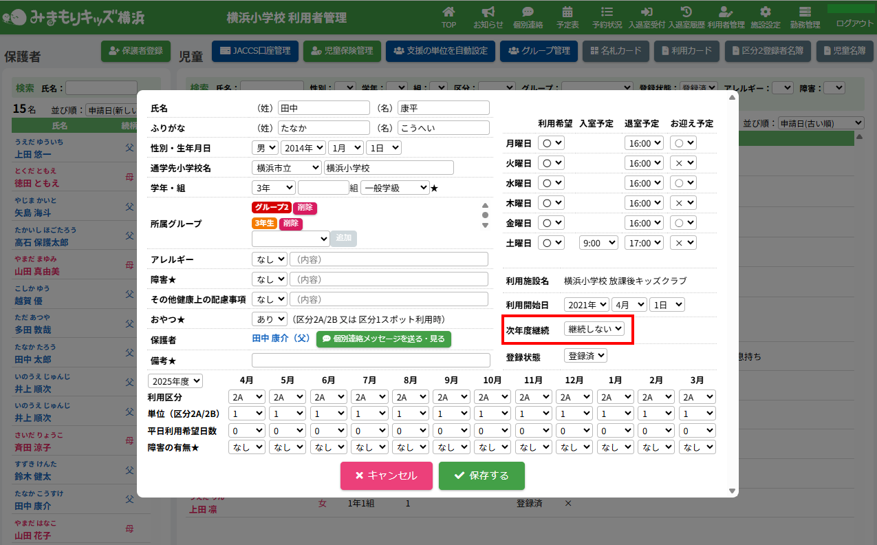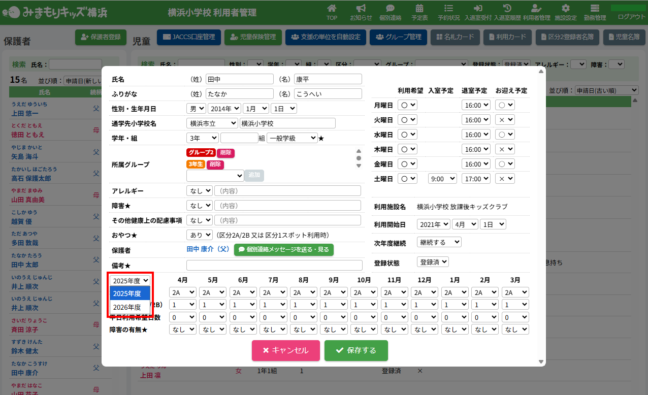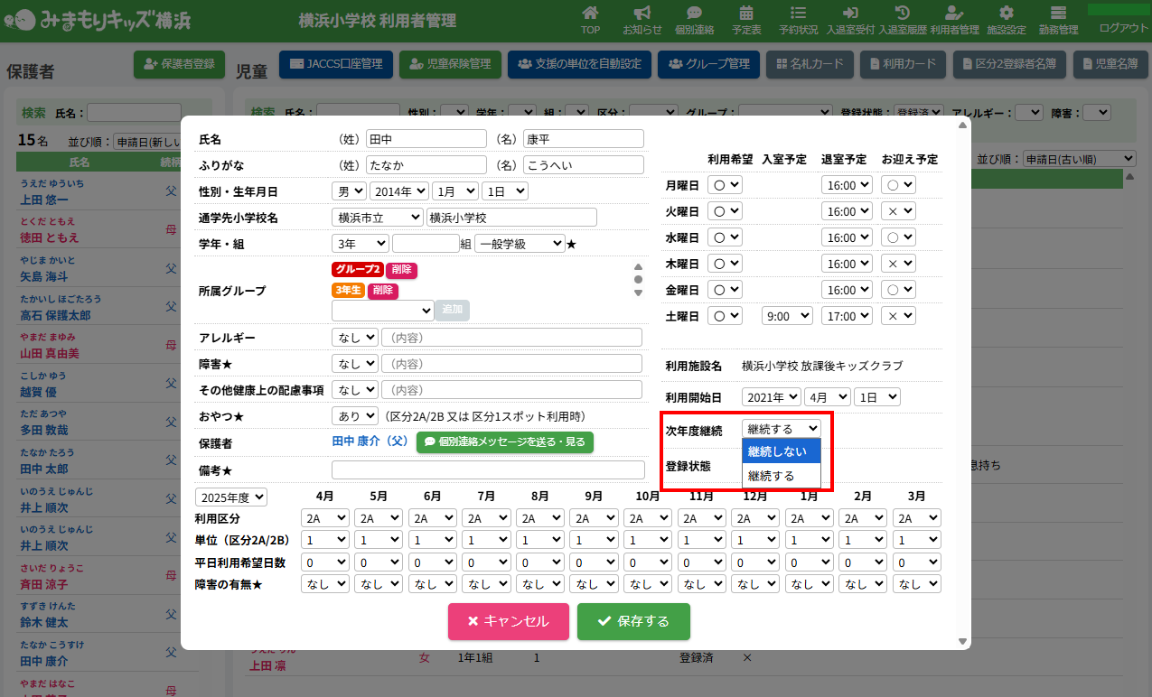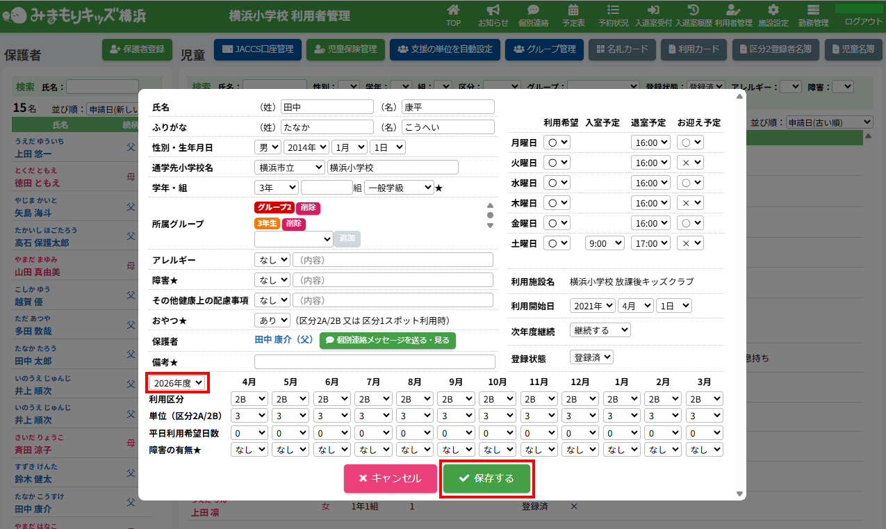 保護者より次年度の利用申込書を受け取り次第、この操作を行います。