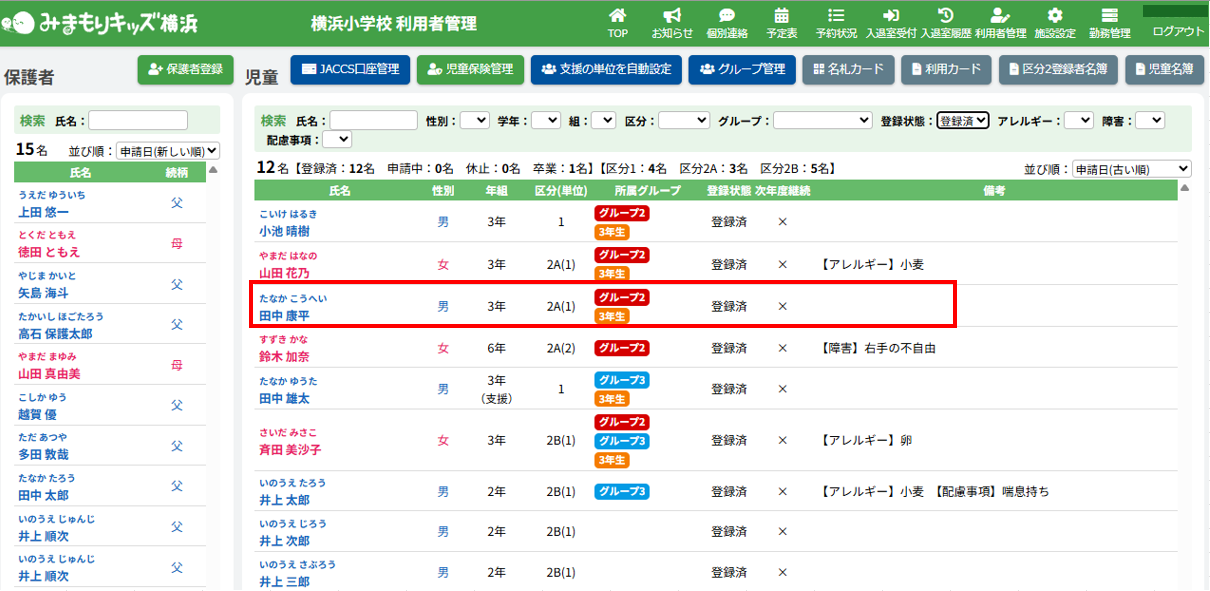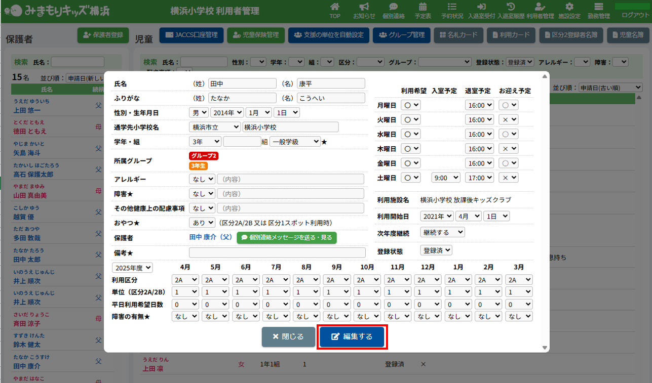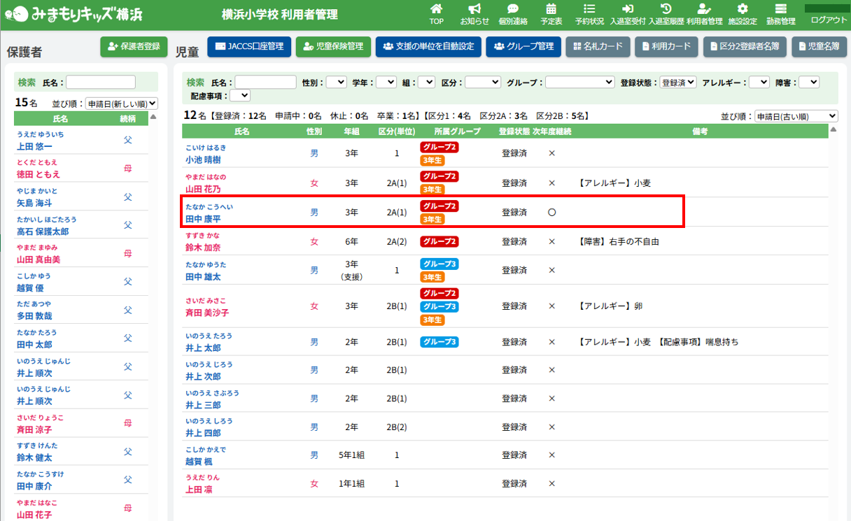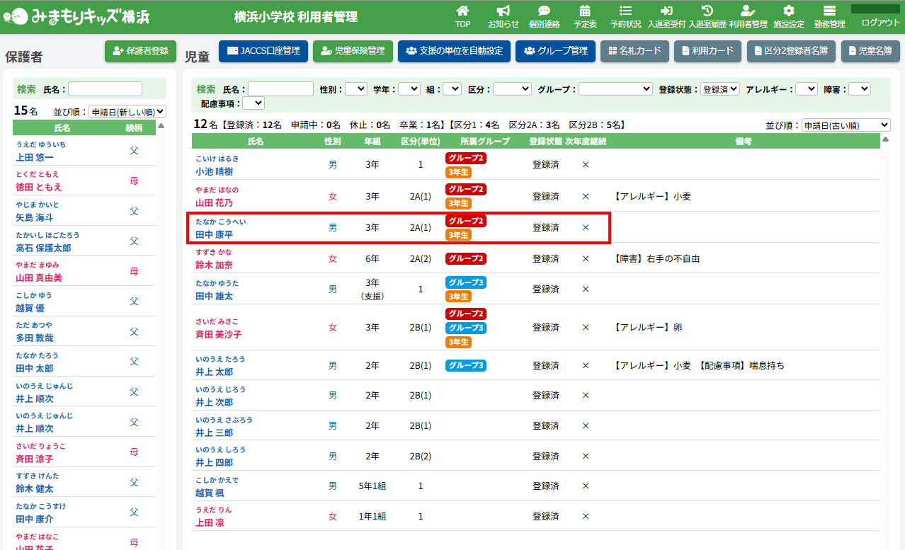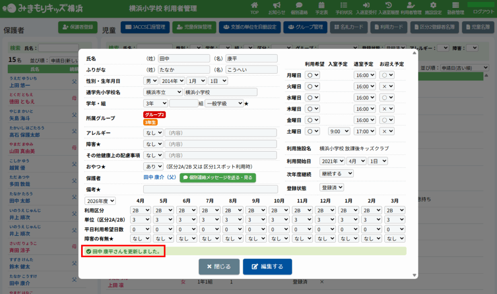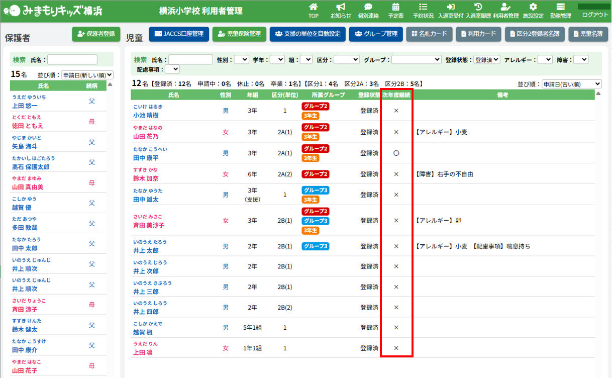 保護者より次年度の利用申込書を受け取り次第、この操作を行います。