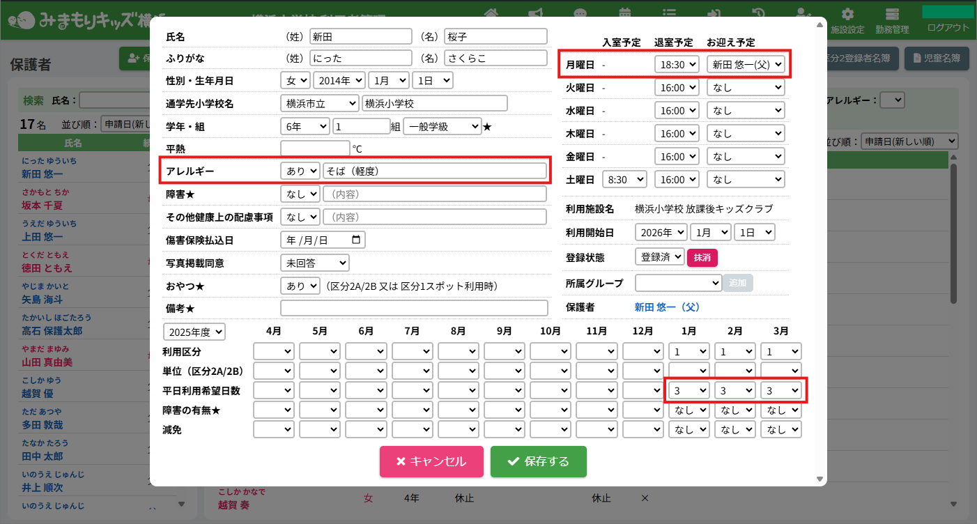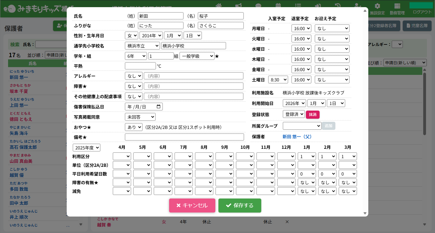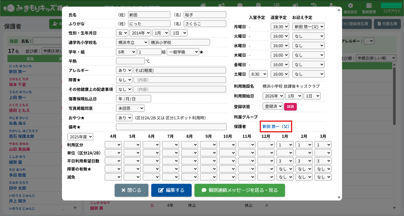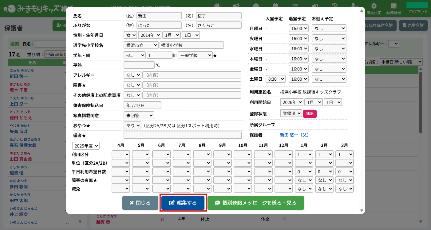 保護者を編集する方法について、詳しくは下記の【保護者の登録内容を変更する】をクリックしてご確認ください。