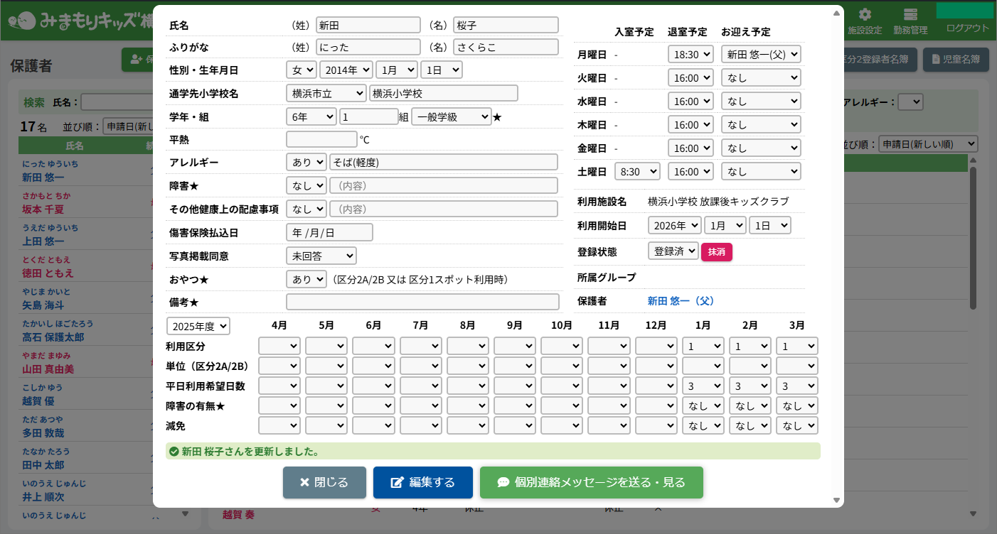 【閉じる】ボタンをクリックして、児童登録内容の変更は完了です。