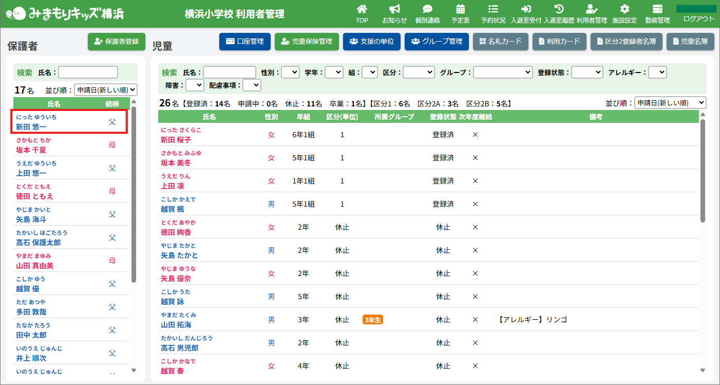 登録内容を変更したい児童の保護者氏名をクリックしてください。