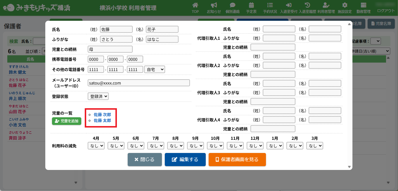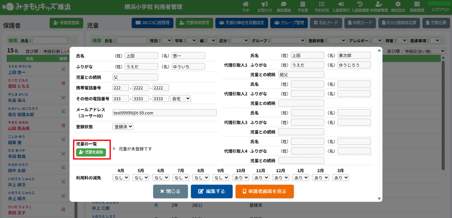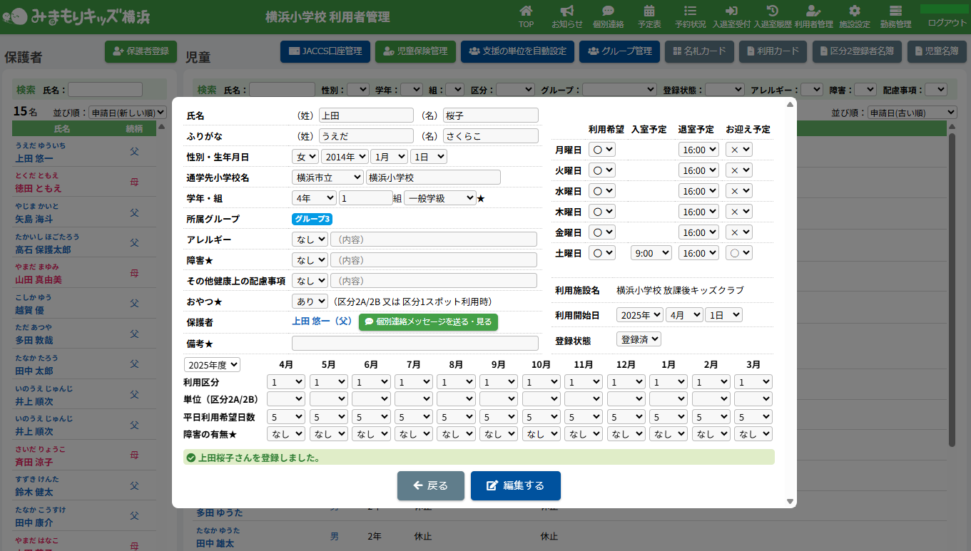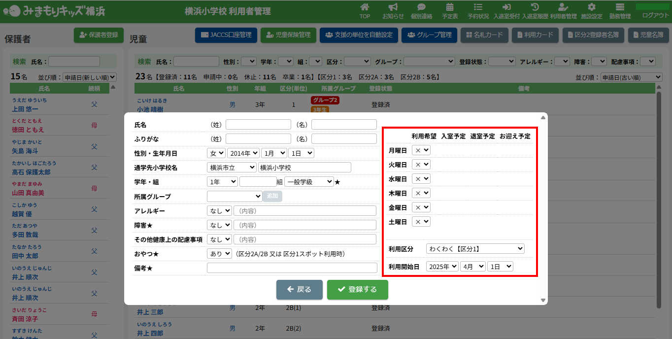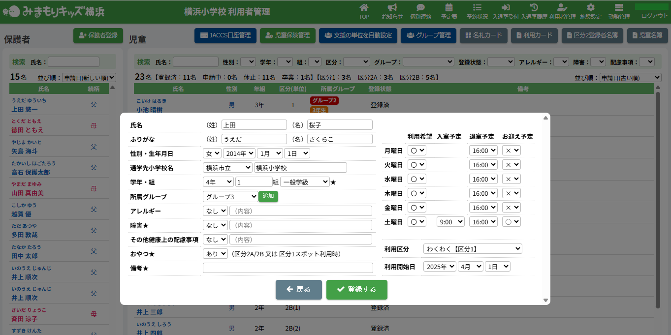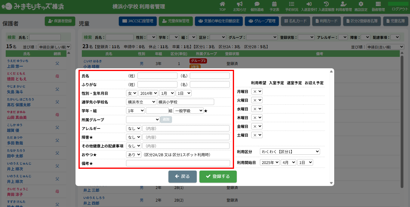HOME > 利用者管理 > 児童を登録する 児童を登録する 「利用者管理」とは…保護者や児童の基本情報を確認・編集する機能です。 ※施設側から児童を登録した場合は「登録状態」が「登録済」になります。 1.児童登録フォームを開く 児童を登録したい保護者氏名をクリックしてください。 2.児童を追加する 【児童を追加】ボタンをクリックし、登録内容入力欄へ進みます。 画像の例は同じ保護者に対してほかの児童が未登録な場合です。他に登録済みの場合は、一覧で表示されます。 <他の児童の登録がお済みの方> ご兄弟など他の児童を登録済みの場合は、一覧で表示されます。 3.登録内容を入力する 〇氏名・ふりがな・性別・生年月日など、各項目へ入力してください。 〇障害の有無は活動日誌や月別状況報告書(月報)に集計されるため、障害を持っている児童は必ず「あり」を選択してください。 ※「支援や配慮を必要とする児童」として扱うのは下記のいずれかを満たす児童です。 ・通学先小学校が「特別支援学校・その他」で登録されていること ・学級が支援学級で登録されていること ・障害が「あり」で、障害の内容が入力されていること 〇児童のおやつは原則「あり」を選択してください。(アレルギーなどの都合でおやつを出さない場合のみ「なし」を選択してください。 〇★マークのついている項目はセンシティブな内容を含むため、保護者側には表示されません。 〇曜日ごとの利用希望・入室予定・退室予定・お迎え予定・利用区分・利用開始日を設定できます。 ・平日は学校が終わり次第受入となるため、入室予定の入力欄はありません。 ・お迎え予定はあくまで予定です。一斉下校時刻を過ぎて退室する場合はお迎えが必要です。 ・利用希望の曜日数は「対象児童」の計算で扱います。 (※区分2A・2Bの児童は土曜日のみの利用希望では登録できません。平日のいずれか1日以上に利用希望を入力してください。) 4.児童の登録を実行する 【登録する】ボタンをクリックして、次へ進みます。 5.児童の登録を完了する 【戻る】ボタンをクリックして児童登録は完了です。 ※施設側から児童を登録した場合は「登録状態」が「登録済」になります。 ≪ 特定の保護者画面を表示する 児童の登録内容を変更する ≫