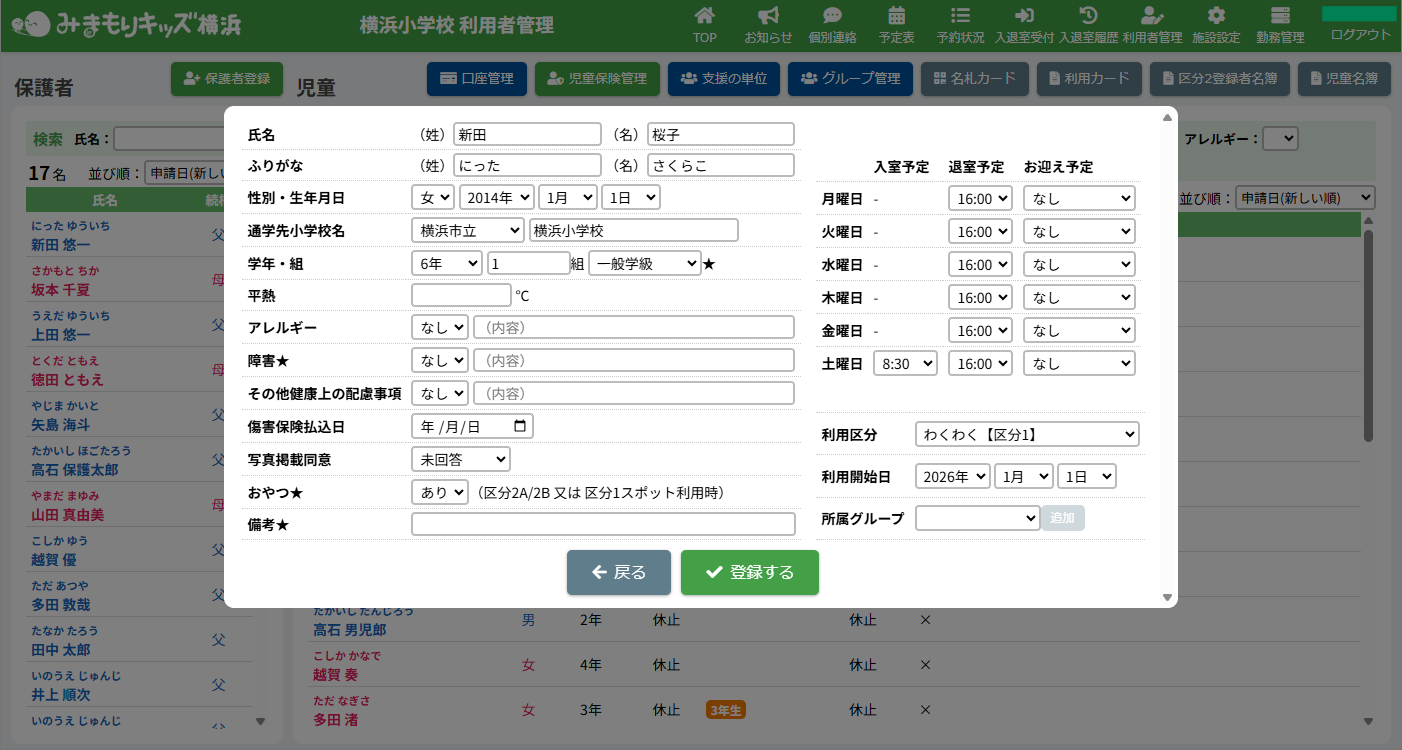 【戻る】ボタンをクリックして児童登録は完了です。