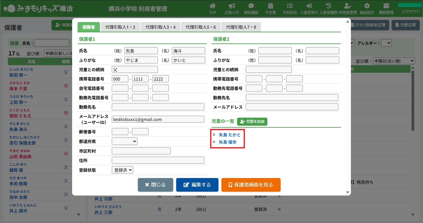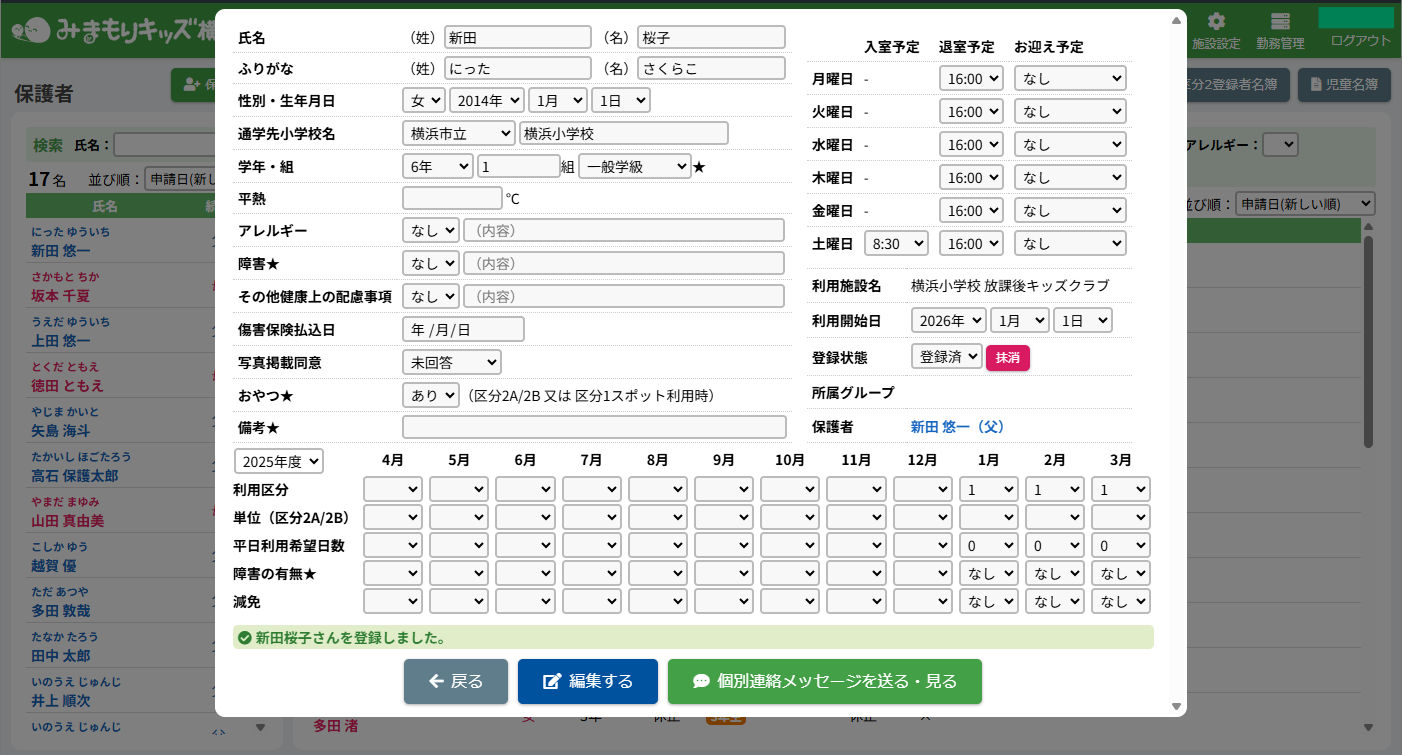 保護者や児童の基本情報を確認・編集する機能です。