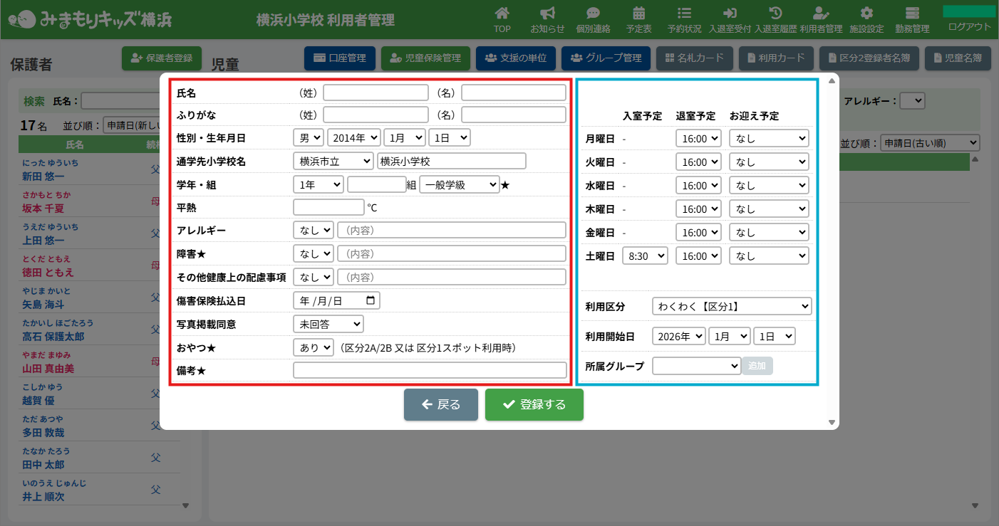 画像の例は同じ保護者に対して児童が未登録の場合です。他に登録済みの場合は、一覧で表示されます。