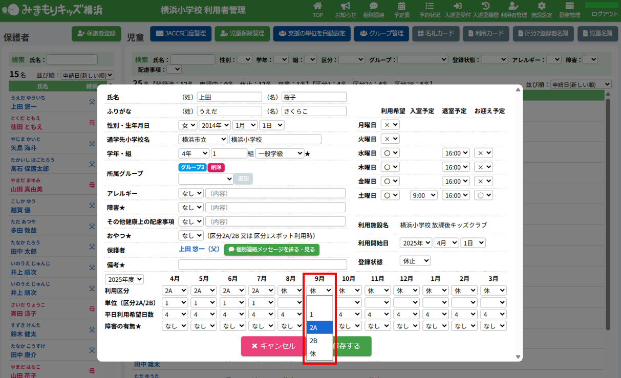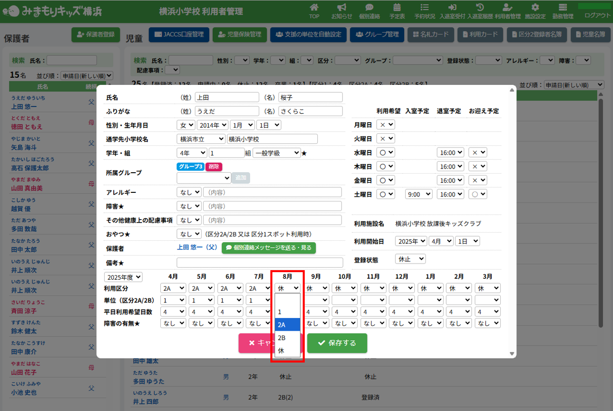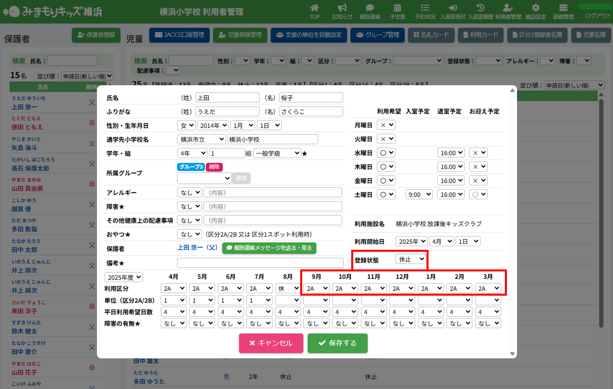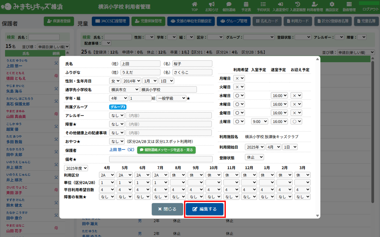 HOME > 利用者管理 > 児童の利用を再開する 児童の利用を再開する 「利用の再開」とは… 休止中の保護者及び児童が利用を再開する場合に使用します。 1.児童詳細を開く 利用を再開したい児童氏名をクリックしてください。 2.児童の登録内容の編集を実行する 【編集する】ボタンをクリックして、次へ進みます。 3.児童の利用を再開する <当月から利用再開する場合> 登録状態欄の選択肢から「登録済」を選択してください。 当月の利用区分欄の選択肢から利用する区分を選択してください。 選択した月とそれ以降の利用区分が指定した区分に変更されます。 8月に区分「2A」で再開する場合、8月の利用区分欄の選択肢から「2A」を選択してください。選択後、8月から翌3月までの月の利用区分が「2A」に変更されます。 <翌月以降から利用再開する場合> 翌月以降から利用を再開する場合、登録状態は変更せず、再開する月の利用区分欄の選択肢から利用する区分を選択してください。選択した月とそれ以降の利用区分が指定した区分に変更されます。9月から区分「2A」で利用を再開する場合、9月の利用区分欄の選択肢から「2A」を選択してください。選択後、9月から翌3月までの月の利用区分が「2A」に変更されます。 4.登録状態の変更を保存する 【保存する】ボタンをクリックして、次へ進みます。 5.利用再開の完了 当月から利用を再開する場合、登録状態が「休止」から「登録済」に、利用区分が選択したものになったことを確認してください。 翌月以降から利用を再開する場合、再開する月になりましたら登録状態が「登録済」に変更されます。 【閉じる】ボタンをクリックしたら、児童の利用の再開は完了です。 ≪ 児童の利用を休止する 児童の登録を抹消する ≫