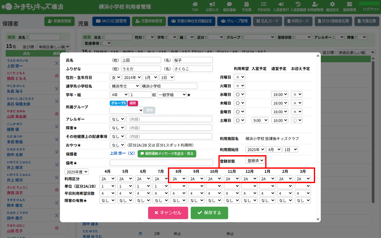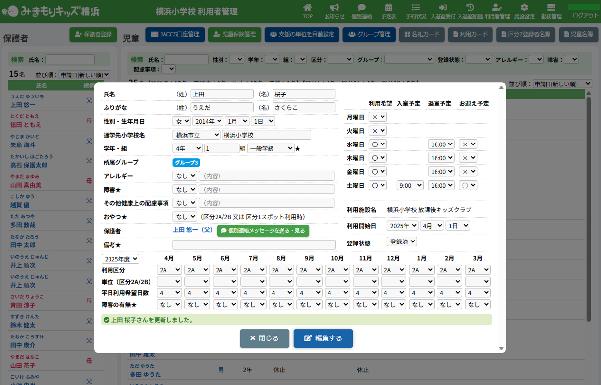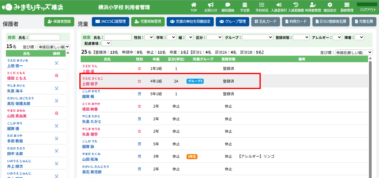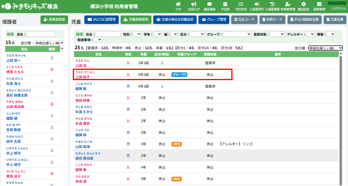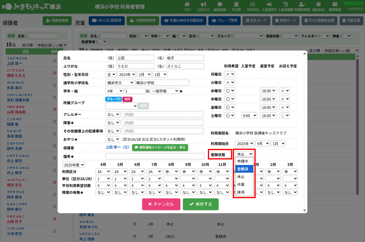 HOME > 利用者管理 > 児童の利用を再開する 児童の利用を再開する 「利用の再開」とは… 休止中の保護者及び児童が利用を再開する場合に使用します。 1.児童詳細を開く 利用を再開したい児童氏名をクリックしてください。 2.児童の登録内容の編集を実行する 【編集する】ボタンをクリックして、次へ進みます。 3.児童の利用を再開する <当月から利用再開する場合> 登録状態欄の選択肢から「登録済」を選択してください。 当月の利用区分欄の選択肢から利用する区分を選択してください。 選択した月とそれ以降の利用区分が指定した区分に変更されます。 8月に区分「2A」で再開する場合、8月の利用区分欄の選択肢から「2A」を選択してください。選択後、8月から翌3月までの月の利用区分が「2A」に変更されます。 <翌月以降から利用再開する場合> 翌月以降から利用を再開する場合、登録状態は変更せず、再開する月の利用区分欄の選択肢から利用する区分を選択してください。選択した月とそれ以降の利用区分が指定した区分に変更されます。9月から区分「2A」で利用を再開する場合、9月の利用区分欄の選択肢から「2A」を選択してください。選択後、9月から翌3月までの月の利用区分が「2A」に変更されます。 4.登録状態の変更を保存する 【保存する】ボタンをクリックして、次へ進みます。 5.利用再開の完了 当月から利用を再開する場合、登録状態が「休止」から「登録済」に、利用区分が選択したものになったことを確認してください。 翌月以降から利用を再開する場合、再開する月になりましたら登録状態が「登録済」に変更されます。 【閉じる】ボタンをクリックしたら、児童の利用の再開は完了です。 ≪ 児童の利用を休止する 児童の登録を抹消する ≫