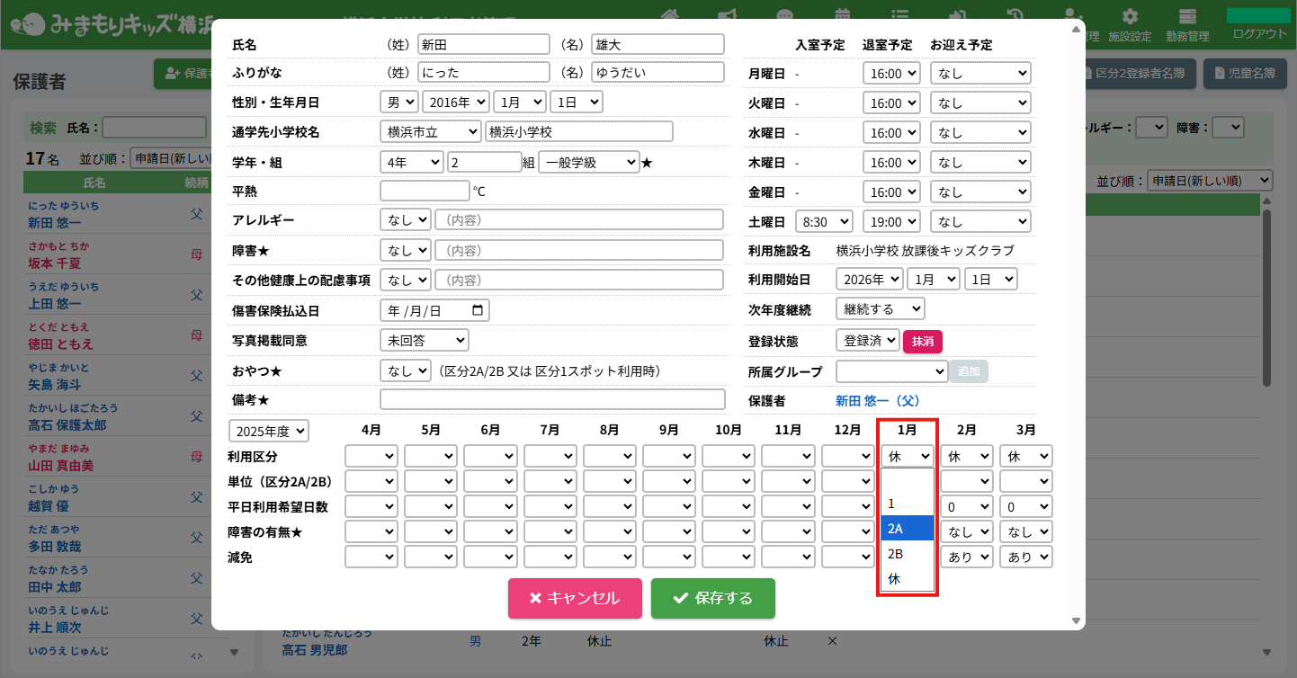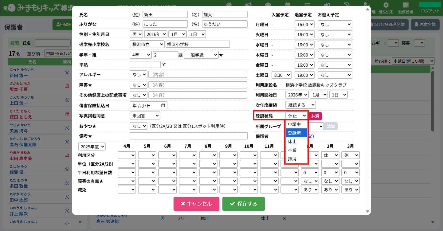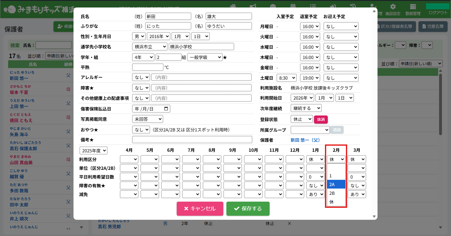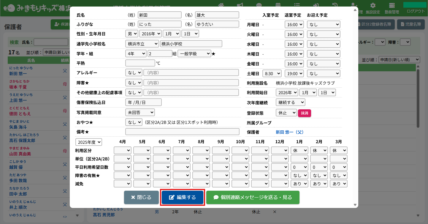 HOME > 利用者管理 > 児童の利用を再開する 児童の利用を再開する 「利用の再開」とは… 休止中の保護者及び児童が利用を再開する場合に使用します。 1.児童詳細を開く 利用を再開したい児童氏名をクリックしてください。 2.児童の登録内容の編集を実行する 【編集する】ボタンをクリックして、次へ進みます。 3.児童の利用を再開する <当月から利用再開する場合> 登録状態欄の選択肢から「登録済」を選択してください。 当月の利用区分欄の選択肢から利用する区分を選択してください。 選択した月とそれ以降の月の利用区分が指定した区分に変更されます。 例:1月に区分「2A」で再開する場合、1月の利用区分欄の選択肢から「2A」を選択してください。選択後、1月から3月までの月の利用区分が「2A」に変更されます。 <翌月以降から利用再開する場合> 翌月以降から利用を再開する場合、登録状態は変更せず、再開する月の利用区分欄の選択肢から利用する区分を選択してください。選択した月とそれ以降の月の利用区分が指定した区分に変更されます。例:2月から区分「2A」で利用を再開する場合、2月の利用区分欄の選択肢から「2A」を選択してください。選択後、2月から3月までの月の利用区分が「2A」に変更されます。 4.登録状態の変更を保存する 【保存する】ボタンをクリックして、次へ進みます。 5.利用再開の完了 当月から利用を再開する場合、登録状態が「休止」から「登録済」に、利用区分が選択したものになったことを確認してください。 翌月以降から利用を再開する場合、再開する月になりましたら登録状態が「登録済」に変更されます。 【閉じる】ボタンをクリックしたら、児童の利用の再開は完了です。 ≪ 児童の利用を休止する 児童の登録を抹消する ≫