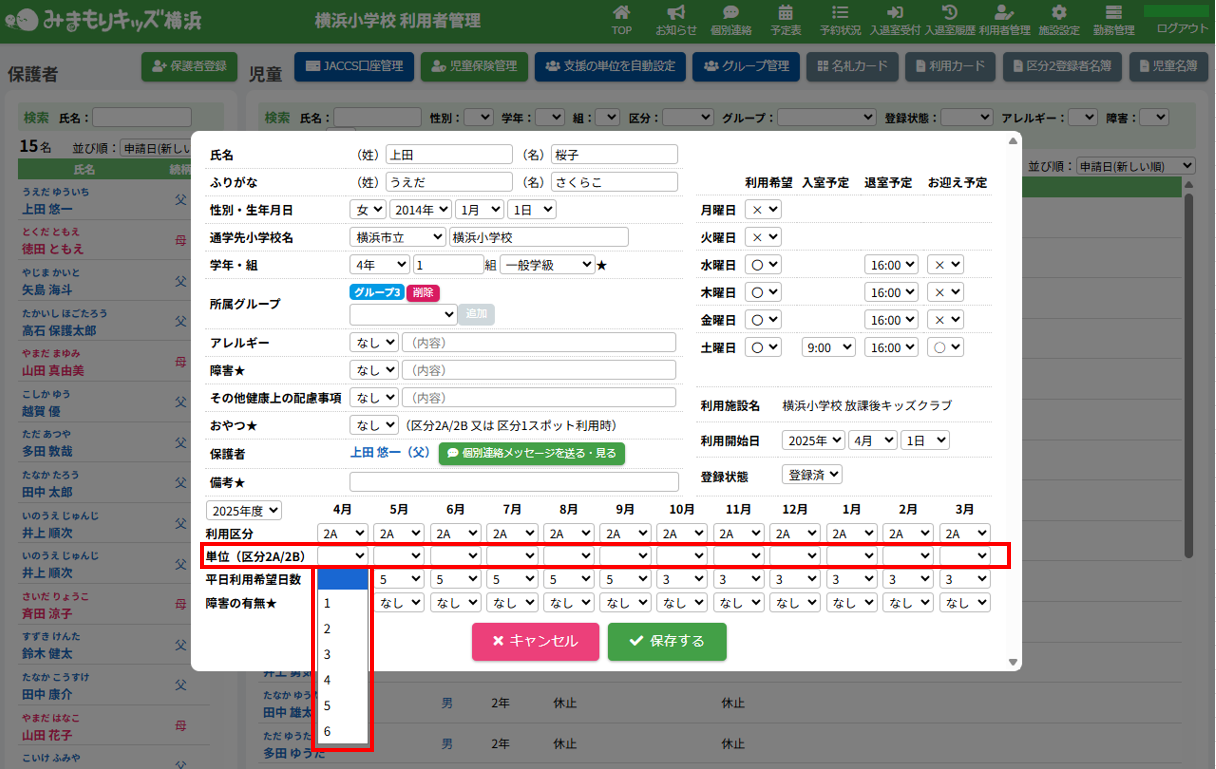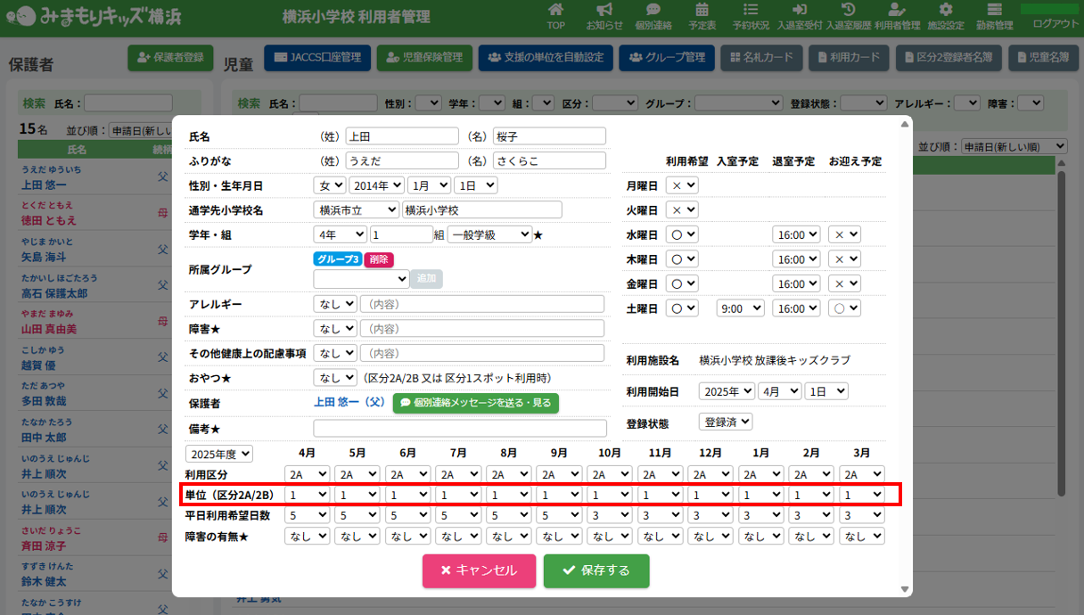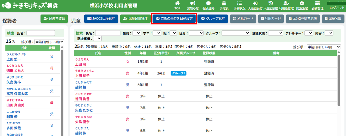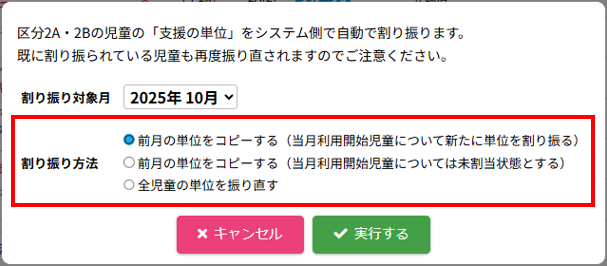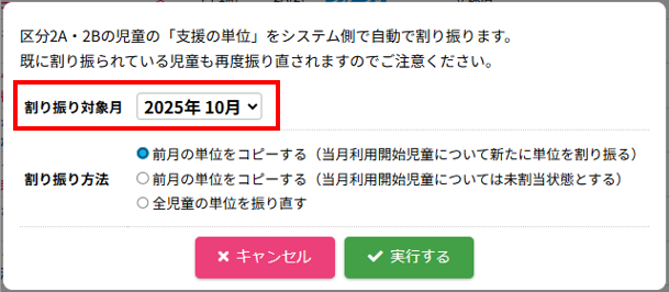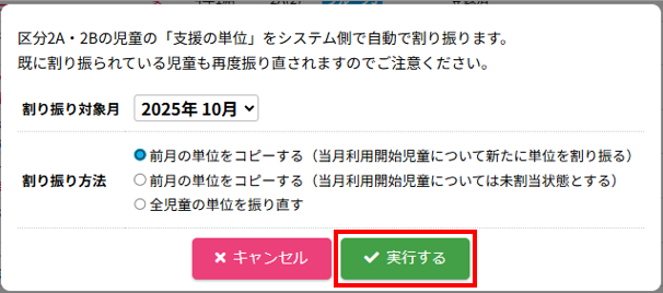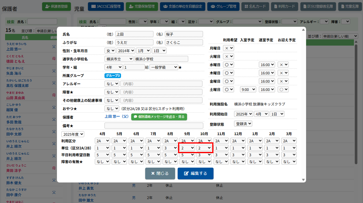 HOME > 利用者管理 > 支援の単位を設定する 支援の単位を設定する 支援の単位を設定する方法は2つあります。 1.区分2A・2Bの児童の月ごとの支援の単位を個別に手動設定する方法 2.区分2A・2Bの全ての児童の月ごとの支援の単位をまとめて自動設定する方法 手動設定した支援の単位は「支援の単位を自動設定」を実行するとコピーを含め、支援の単位が上書きされます。ご注意ください。 ※「すくすく(ゆうやけ)【区分2A】」と「すくすく(ほしぞら)【区分2B】」の児童は、支援の単位が割り振られている必要があります。「わくわく【区分1】」の児童に支援の単位を割り振ることはありません。 1.支援の単位を手動設定する 1.児童詳細を開く 児童の一覧からを変更したい児童氏名をクリックしてください。 2.児童の登録内容の編集を実行する 【編集する】ボタンをクリックして、次へ進みます。 3.支援の単位を設定する 項目に沿って変更したい内容を選択してください。月ごとに変更することができます。 (例:画像では「11月」の支援の単位を「2」→「6」へ変更しています。) 4.変更を保存する 【保存する】ボタンをクリックして、次へ進みます。 5.変更の完了 【閉じる】ボタンをクリックして、支援の単位の手動設定は完了です。 2.支援の単位を自動設定する 1.支援の単位を自動設定フォームを開く 利用者管理画面の上部にある【支援の単位を自動設定】ボタンをクリックしてください。 2.支援の単位を自動設定する月を選択する 支援の単位を自動設定したい月(=割り振り対象月)を選択してください。 3.支援の単位の自動設定の方法を選択する 支援の単位の自動設定の方法(=割り振り方法)を選択してください。 区分2Bの児童を優先的に、支援の単位1から自動で割り振ります。 例:「割り振り対象月」に「10月」を選択し、「割り振り方法」に「前月の単位をコピーする」を選んだ場合は「9月」の支援の単位をコピーします。 ※いずれの割り振り方法も既に設定されている支援の単位を上書きします。ご注意ください。 4.支援の単位の自動設定を実行する 【実行する】ボタンをクリックし、支援の単位の児童設定を実行してください。 5.支援の単位の自動設定を確認する 画面上部にアナウンスが表示されていることと支援の単位が設定されていることを確認してください。 支援の単位の確認 1.児童詳細を開く 区分2A・2Bの児童をクリックし、詳細を開いてください。 2.単位欄を確認する 児童詳細の中の「単位」欄の割り振り対象月に支援の単位を表す数字が割り振られている(コピーされている)ことを確認してください。 例:「割り振り対象月」に「10月」を選択し、「割り振り方法」に「前月の単位をコピーする」を選んだため、「9月」の支援の単位がコピーされています ≪ 利用区分を変更する 平日利用希望日数を変更する ≫