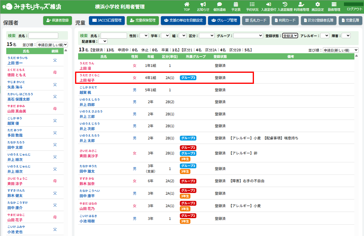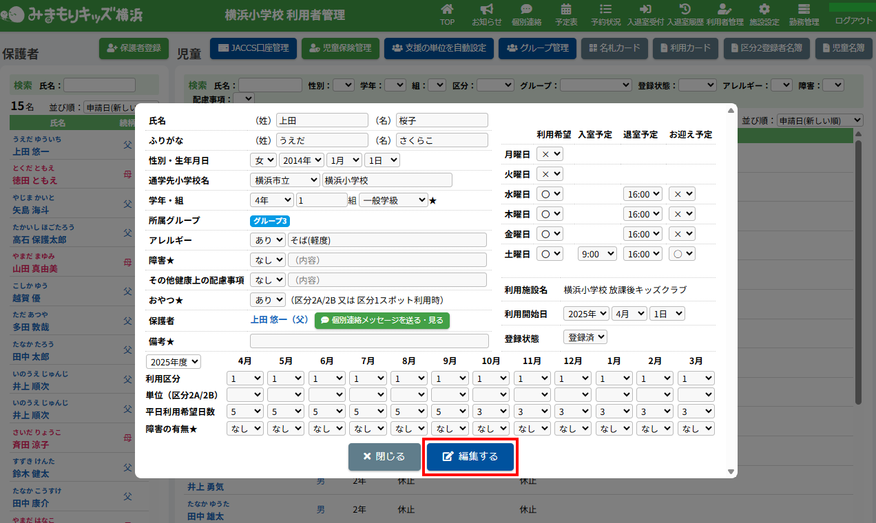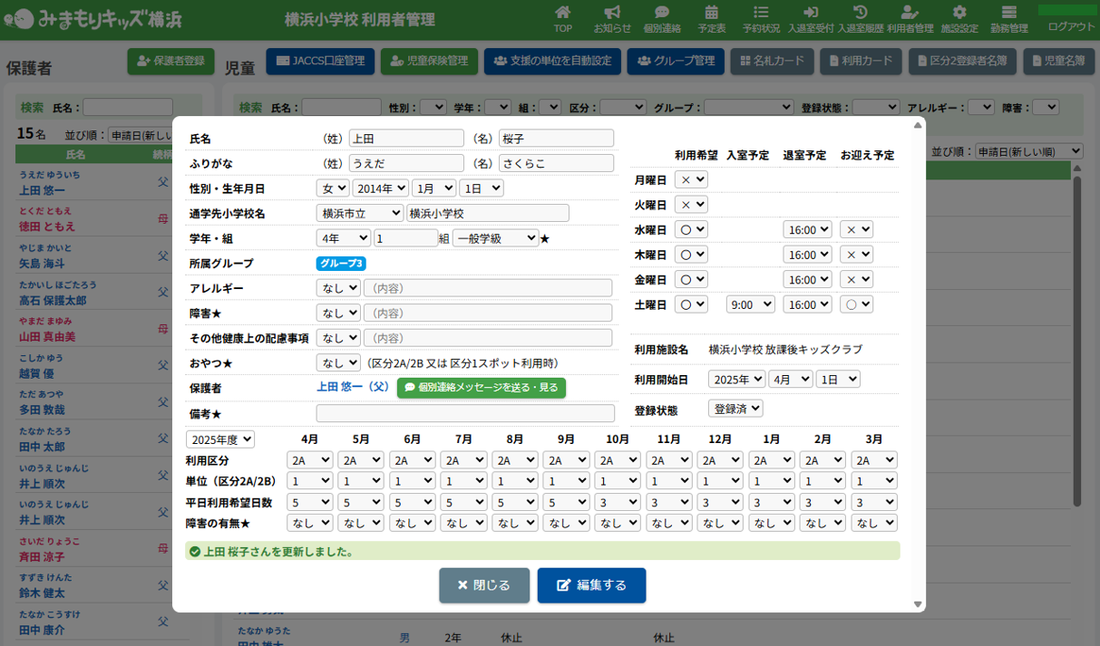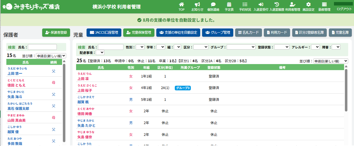 HOME > 利用者管理 > 支援の単位を設定する 支援の単位を設定する 支援の単位を設定する方法は2つあります。 1.区分2A・2Bの児童の月ごとの支援の単位を個別に手動設定する方法 2.区分2A・2Bの全ての児童の月ごとの支援の単位をまとめて自動設定する方法 手動設定した支援の単位は「支援の単位を自動設定」を実行するとコピーを含め、支援の単位が上書きされます。ご注意ください。 ※「すくすく(ゆうやけ)【区分2A】」と「すくすく(ほしぞら)【区分2B】」の児童は、支援の単位が割り振られている必要があります。「わくわく【区分1】」の児童に支援の単位を割り振ることはありません。 1.支援の単位を手動設定する 1.児童詳細を開く 児童の一覧からを変更したい児童氏名をクリックしてください。 2.児童の登録内容の編集を実行する 【編集する】ボタンをクリックして、次へ進みます。 3.支援の単位を設定する 項目に沿って変更したい内容を選択してください。月ごとに変更することができます。 (例:画像では「11月」の支援の単位を「2」→「6」へ変更しています。) 4.変更を保存する 【保存する】ボタンをクリックして、次へ進みます。 5.変更の完了 【閉じる】ボタンをクリックして、支援の単位の手動設定は完了です。 2.支援の単位を自動設定する 1.支援の単位を自動設定フォームを開く 利用者管理画面の上部にある【支援の単位を自動設定】ボタンをクリックしてください。 2.支援の単位を自動設定する月を選択する 支援の単位を自動設定したい月(=割り振り対象月)を選択してください。 3.支援の単位の自動設定の方法を選択する 支援の単位の自動設定の方法(=割り振り方法)を選択してください。 区分2Bの児童を優先的に、支援の単位1から自動で割り振ります。 例:「割り振り対象月」に「10月」を選択し、「割り振り方法」に「前月の単位をコピーする」を選んだ場合は「9月」の支援の単位をコピーします。 ※いずれの割り振り方法も既に設定されている支援の単位を上書きします。ご注意ください。 4.支援の単位の自動設定を実行する 【実行する】ボタンをクリックし、支援の単位の児童設定を実行してください。 5.支援の単位の自動設定を確認する 画面上部にアナウンスが表示されていることと支援の単位が設定されていることを確認してください。 支援の単位の確認 1.児童詳細を開く 区分2A・2Bの児童をクリックし、詳細を開いてください。 2.単位欄を確認する 児童詳細の中の「単位」欄の割り振り対象月に支援の単位を表す数字が割り振られている(コピーされている)ことを確認してください。 例:「割り振り対象月」に「10月」を選択し、「割り振り方法」に「前月の単位をコピーする」を選んだため、「9月」の支援の単位がコピーされています ≪ 利用区分を変更する 平日利用希望日数を変更する ≫
