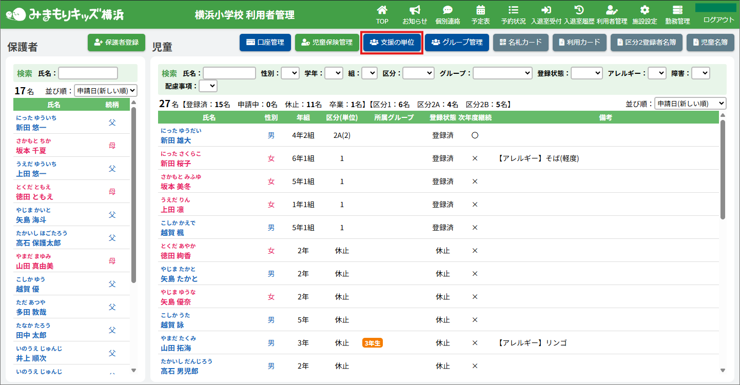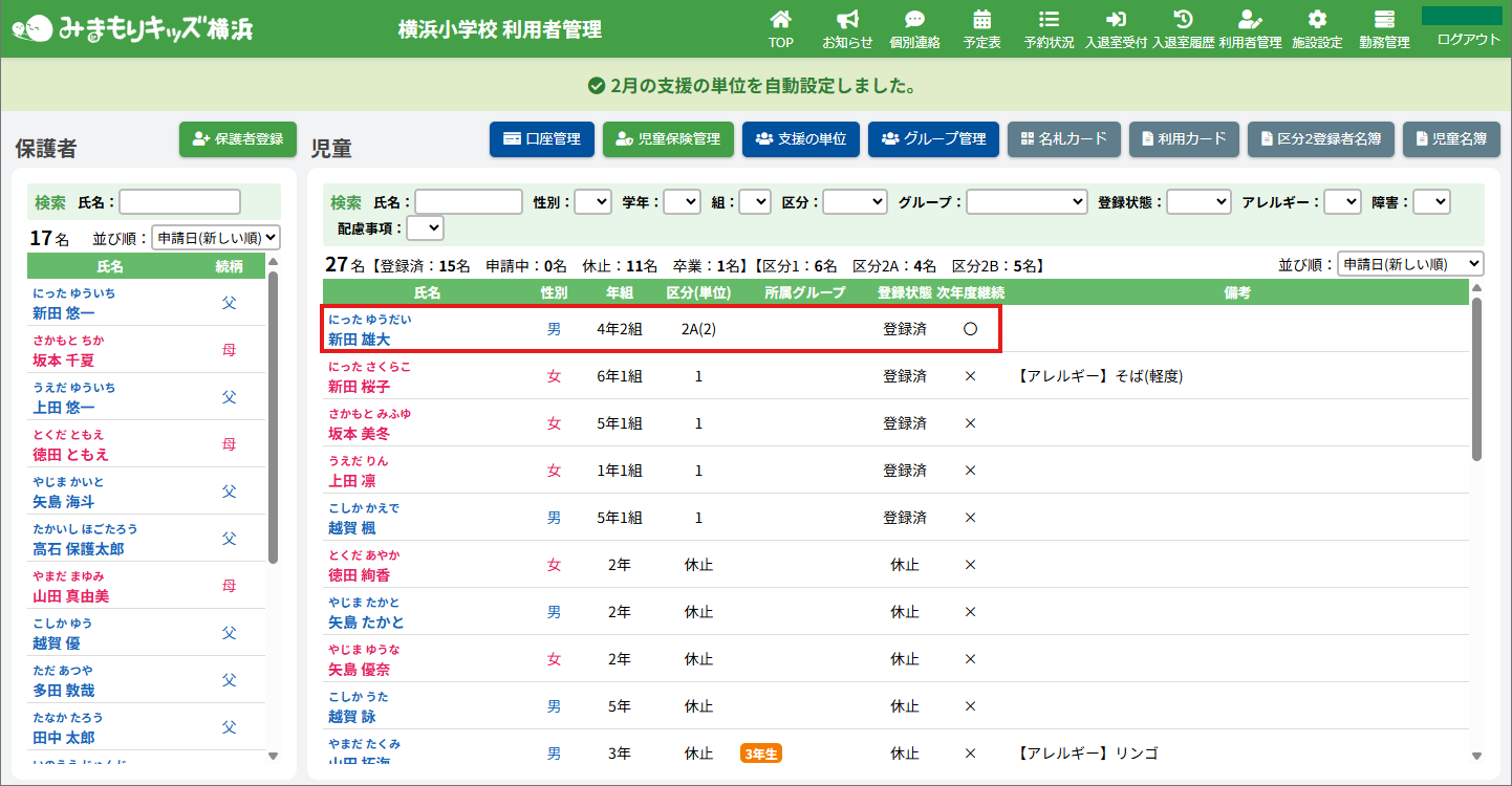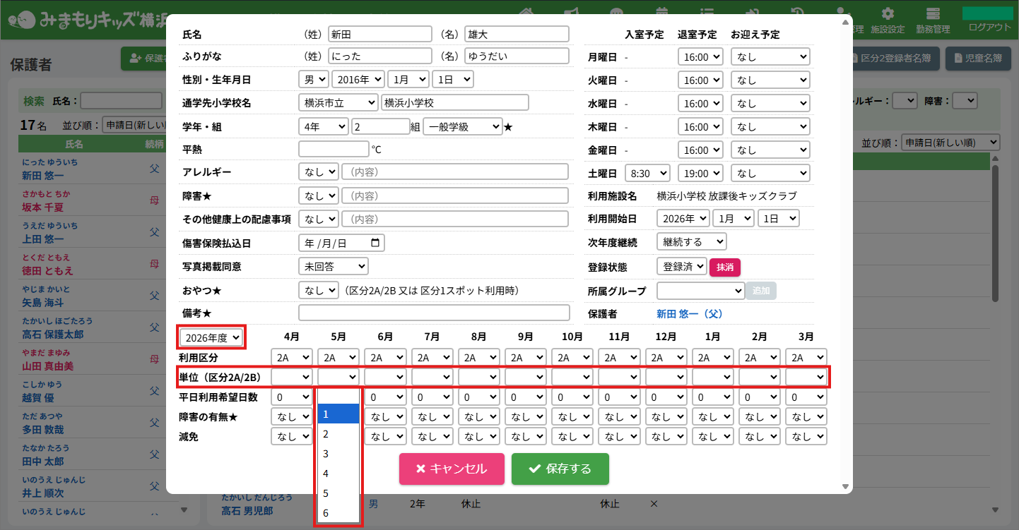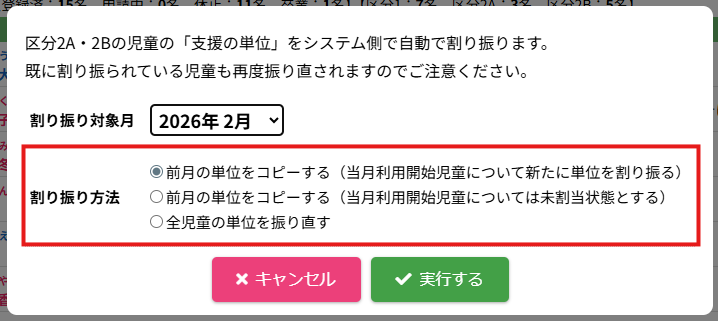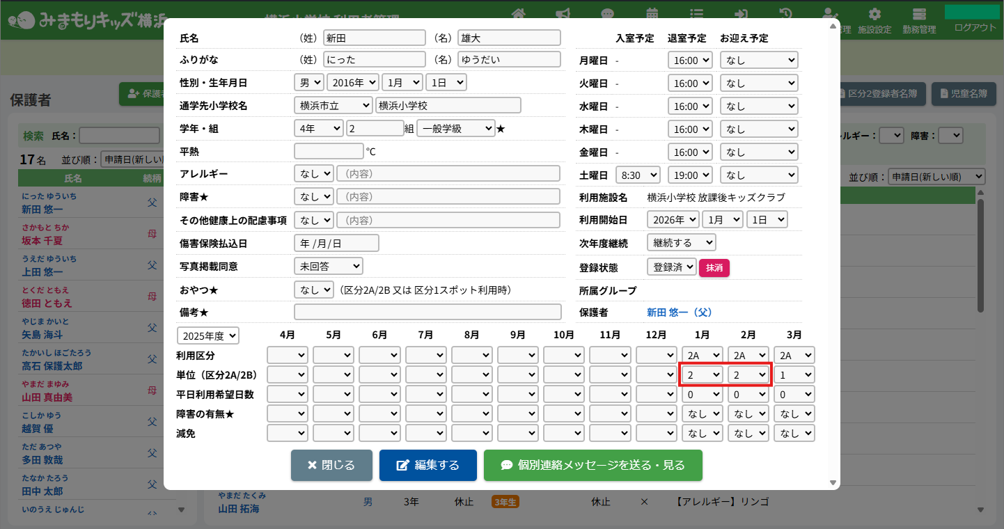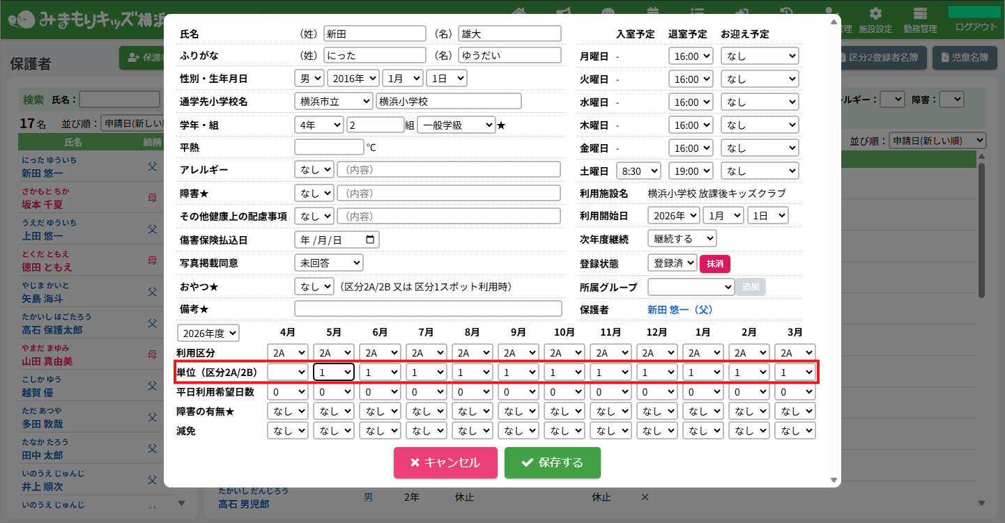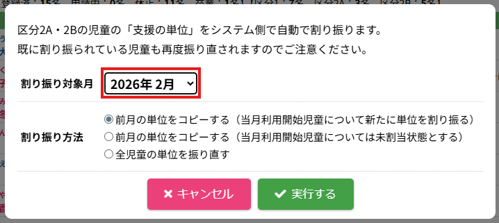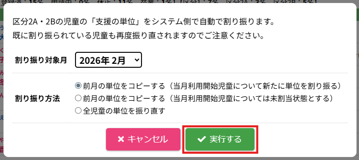 HOME > 利用者管理 > 支援の単位を設定する 支援の単位を設定する 支援の単位を設定する方法は2つあります。 1.区分2A・2Bの児童の月ごとの支援の単位を個別に手動設定する方法 2.区分2A・2Bの全ての児童の月ごとの支援の単位をまとめて自動設定する方法 手動設定した支援の単位は「支援の単位を自動設定」を実行するとコピーを含め、支援の単位が上書きされます。ご注意ください。 ※「すくすく(ゆうやけ)【区分2A】」と「すくすく(ほしぞら)【区分2B】」の児童は、支援の単位が割り振られている必要があります。「わくわく【区分1】」の児童に支援の単位を割り振ることはありません。 1.支援の単位を手動設定する 1.児童詳細を開く 児童の一覧からを変更したい児童氏名をクリックしてください。 2.児童の登録内容の編集を実行する 【編集する】ボタンをクリックして、次へ進みます。 3.支援の単位を設定する 単位欄の項目に沿って変更したい内容を選択してください。 年度と月を選択し変更することができます。変更した月とそれ以降の月に設定が適用されます。 4.変更を保存する 【保存する】ボタンをクリックして、次へ進みます。 5.変更の完了 【閉じる】ボタンをクリックして、支援の単位の手動設定は完了です。 2.支援の単位を自動設定する 1.支援の単位を自動設定フォームを開く 利用者管理画面の上部にある【支援の単位】ボタンをクリックしてください。 2.支援の単位を自動設定する月を選択する 支援の単位を自動設定したい月(=割り振り対象月)を選択してください。 3.支援の単位の自動設定の方法を選択する 支援の単位の自動設定の方法(=割り振り方法)を選択してください。 区分2Bの児童を優先的に、支援の単位1から自動で割り振ります。 例:「割り振り対象月」に「2月」を選択し、「割り振り方法」に「前月の単位をコピーする」を選んだ場合は「1月」の支援の単位をコピーします。 ※いずれの割り振り方法も既に設定されている支援の単位を上書きします。ご注意ください。 4.支援の単位の自動設定を実行する 【実行する】ボタンをクリックし、支援の単位の児童設定を実行してください。 5.支援の単位の自動設定を確認する 画面上部にアナウンスが表示されていることと支援の単位が設定されていることを確認してください。 支援の単位の確認 1.児童詳細を開く 区分2A・2Bの児童をクリックし、詳細を開いてください。 2.単位欄を確認する 児童詳細の中の「単位」欄の割り振り対象月に支援の単位を表す数字が割り振られている(コピーされている)ことを確認してください。 例:「割り振り対象月」に「2月」を選択し、「割り振り方法」に「前月の単位をコピーする」を選んだため、「1月」の支援の単位がコピーされています ≪ 利用区分を変更する 平日利用希望日数を変更する ≫