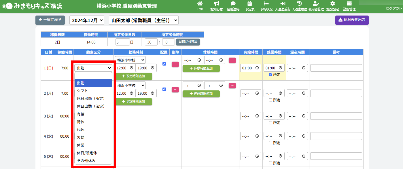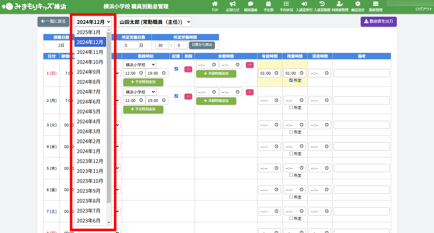1.勤怠管理内容で、更新したい職員の職員別勤怠管理画面を開く