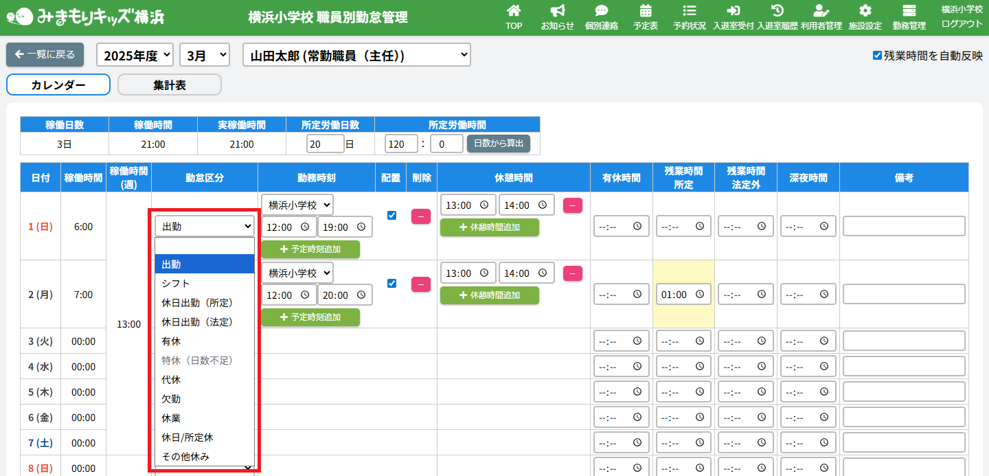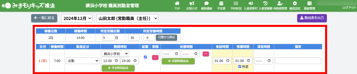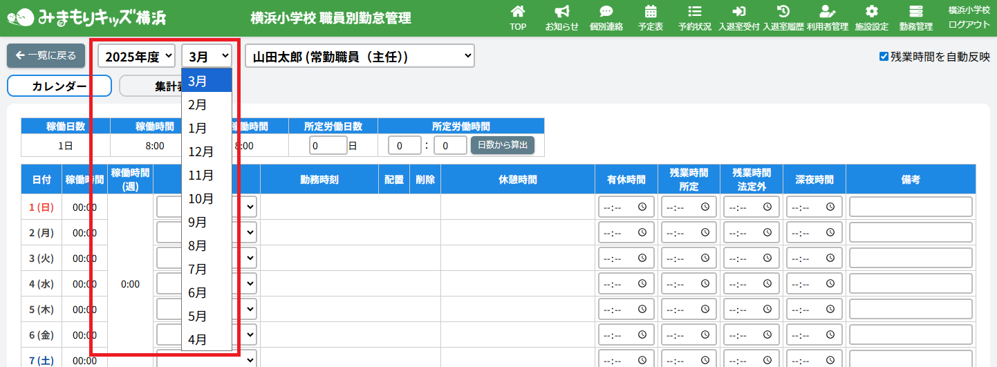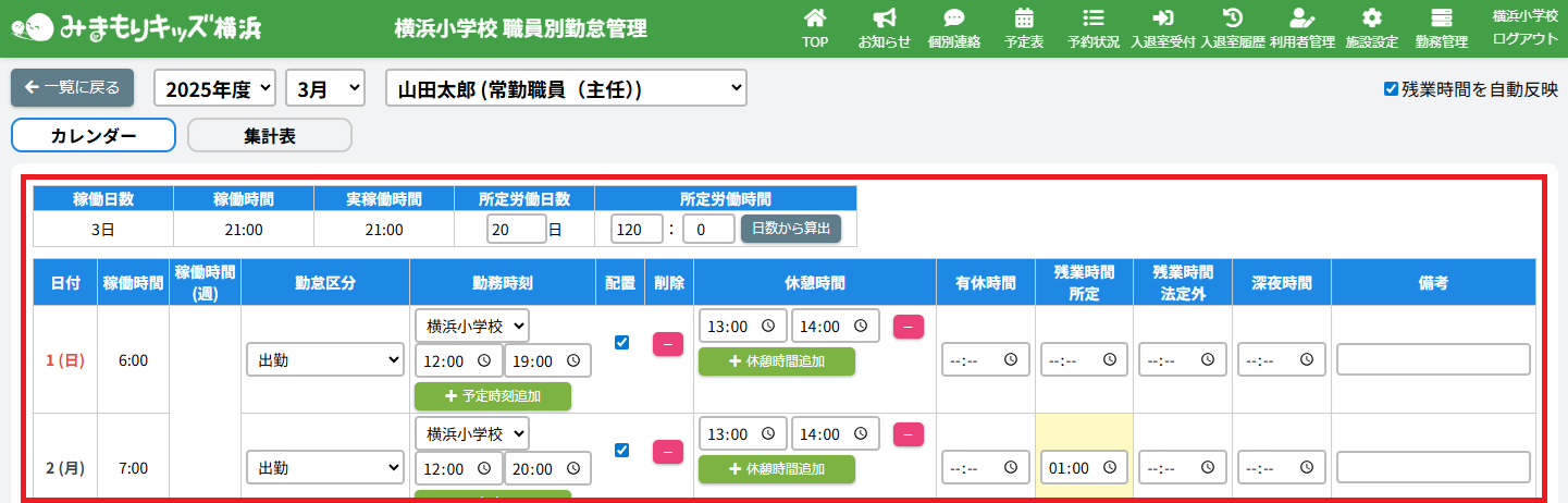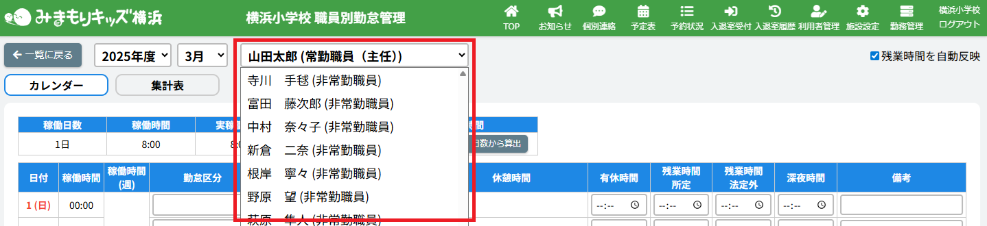 時間を入力すると、その職員の稼働時間が自動的に表示されます。