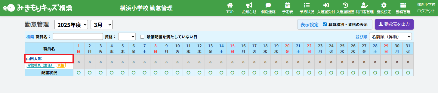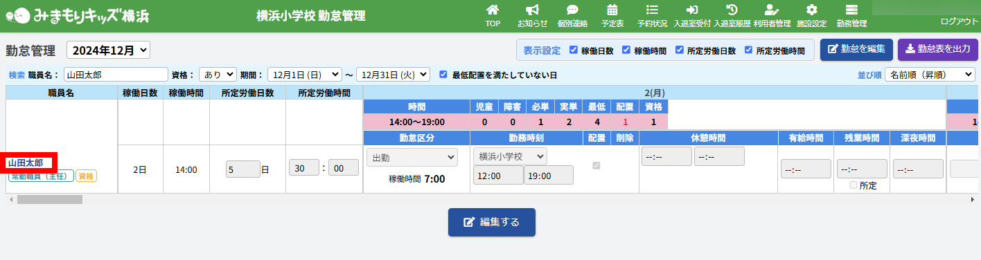 施設側画面(勤務管理メニュー)勤怠管理 職員別で勤怠管理内容を更新する