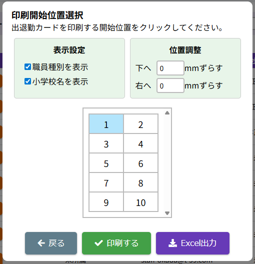HOME > 勤務管理 > 出退勤カードを出力する 出退勤カードを出力する ≪【入退室受付】QRコードの出退勤カードでの入退室について≫ 1.施設管理画面 入退室受付画面を開く 施設側施設トップ画面でメニュー【入退室受付】ボタンをクリックしてください。 2.職員向け用のQRコードカードで、情報を読み取る QRコードリーダーに、職員向け用のQRコードカードを読み取ってください。 3.入退室受付画面で職員の出退勤を確認する 画面に読み込むと、画面に大きく職員名やその職員の出退勤時間の表示・自動記録がされます。 ※施設管理【勤務管理】勤怠管理画面でも出退勤の手入力が可能です。 ≪職員が【出勤】した際の画面表示≫ ≪職員が【退勤】した際の画面表示≫ ≪出退勤カードの出力方法について≫ 1.【出力対象職員選択】ポップアップを開く 職員管理画面で【出退勤カード出力】ボタンをクリックしてください。 2.カードの出力を行う職員を選択する 出力対象職員選択ポップアップでカードを出力したい職員を選択し、各入力欄・項目に沿って入力・選択をしてください。 <【出力対象職員選択】の選択欄について> ①【全選択】ボタン 出力する職員をすべて選択します。 ②【全解除】ボタン 選択した職員をすべて解除します。 ≪職員の絞り込みを行う際の入力欄について≫ ①【職員名・職員コード】 各項目に沿って入力してください。 ②【所属】 各施設を選ぶことができます。自分の所属している施設を選択してください。 ③【社員種別】 【正規社員・非正規社員・未設定】を選ぶことができます。絞りたい種別を選択してください。 3.カードの出力を行う職員の選択を完了する 入力・選択後、【次へ】ボタンをクリックしてください。 4.印刷オプション・印刷開始位置を選択する 印刷開始位置選択ポップアップで表示設定、位置調整数値の入力、または位置の番号を選択してください。 5.印刷開始位置の選択を完了する 選択後、画面下にある【印刷する】ボタンまたは【Excel出力】をクリックしてください。 【印刷する】の場合、印刷用の画面が表示されます。 【Excel出力】の場合、出退勤カードのExcelファイルがダウンロードされます。 6.出退勤カードの印刷内容の設定を行う データ印刷画面で出力データのプレビューが表示されます。出退勤カードには、各職員の出退勤用QRコードが表示されます。印刷内容の設定をしてください。 <【印刷内容設定】の選択欄について> ①【送信先】 出力を行うプリンターを選択してください。 ②【ページ】 【すべて】【カスタム】のいずれかを選択してください。 ③【部数】 部数を入力してください。 ④【カラー】 「カラー」「白黒」のいずれかを選択してください。 ⑤【詳細設定】 使用しないので設定は不要です。 7.出退勤カードを印刷する 設定・確認後、【印刷】ボタンをクリックしてください。 8.出退勤カードの印刷を完了する 問題なく印刷ができたら完了です。印刷後、再印刷を行う際は、【再印刷】ボタンをクリックしてください。【閉じる】をクリックすると、法人職員管理画面に戻ります。 ≪ 有休付与を一括で行う カレンダーを編集する ≫