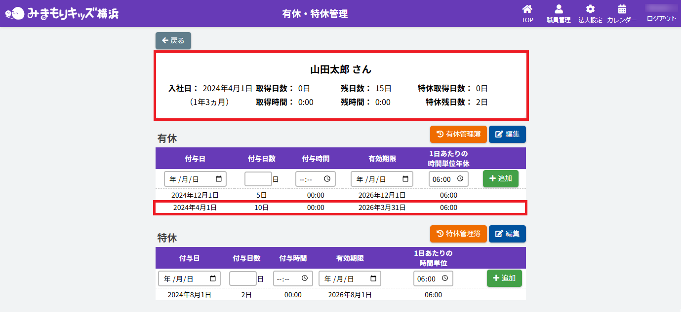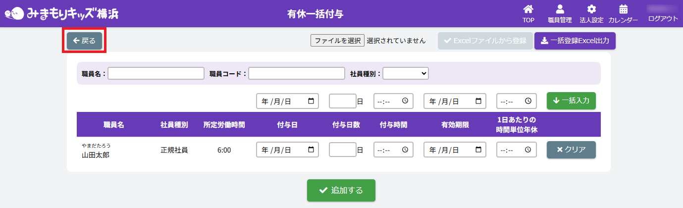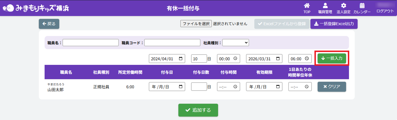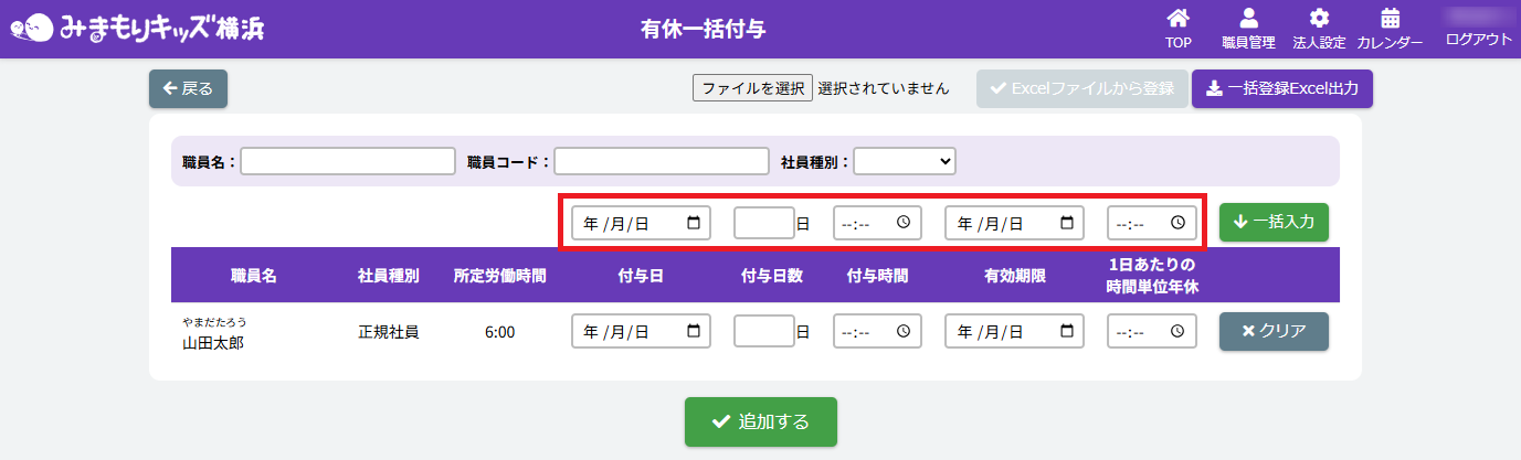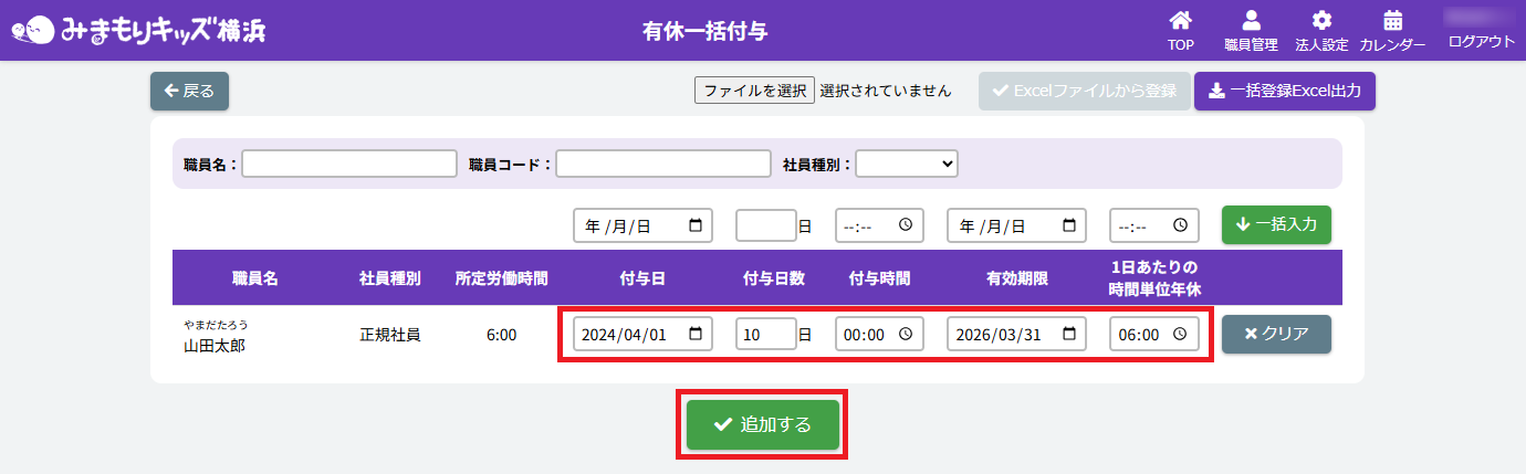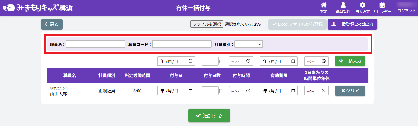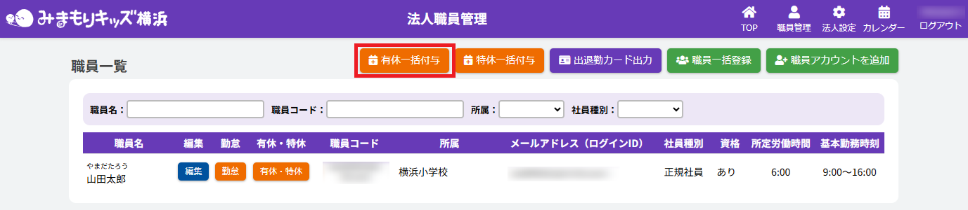 HOME > 勤務管理 > 有休付与を一括で行う 有休付与を一括で行う 1.【有休一括付与】画面を開く 法人職員管理画面で【有休一括付与】ボタンをクリックしてください。 2.一括で内容を反映したい各職員を絞る 有休一括付与画面で職員絞り込み内容を各入力欄・項目に沿って入力・選択をしてください。 <【有休一括付与内容】の絞り込み入力欄について> ①【職員名・職員コード】 各項目に沿って入力してください。 ②【社員種別】 【正規社員・非正規社員・未設定】を選ぶことができます。絞りたい種別を選択してください。 3.有休付与内容の一括入力 各有休付与内容の各入力欄・項目に沿って入力・選択をしてください。 <【有休一括付与内容】の入力欄について> ①【付与日・付与日数・有効期限】 各項目に沿って入力してください。 ②【付与時間】 システムの使い始めや時間休(繰り越しなど)を使用する場合に入力してください。 ③【1日あたりの時間単位年休】 有休を取得した際に働いた時間分を入力してください。 ④【クリア】ボタン 各職員の有休付与内容がリセットされます。 ⑤【追加する】ボタン 各職員の有休付与内容が有休管理画面に追加されます。 4.一括入力をした有休付与内容を追加する 1.入力後、【一括入力】ボタンをクリックしてください。 2.一括入力欄で入力した内容が全職員の入力欄に反映されていることを確認したら、【追加する】ボタンをクリックしてください。 5.一括入力をした有休付与内容を確認・完了する 1.画面で入力した内容は、有休・特休管理画面の各職員の有休付与情報に追加されます。有休付与内容確認の際は、画面の【戻る】ボタンをクリックしてください。 2.法人職員管理画面で【有休・特休】ボタンをクリックしてください。 3.有休・特休管理画面で各職員に有休休暇が付与されていたら完了です。 ≪ 職員の有休日数と特休日数を確認・入力・編集する 出退勤カードを出力する ≫