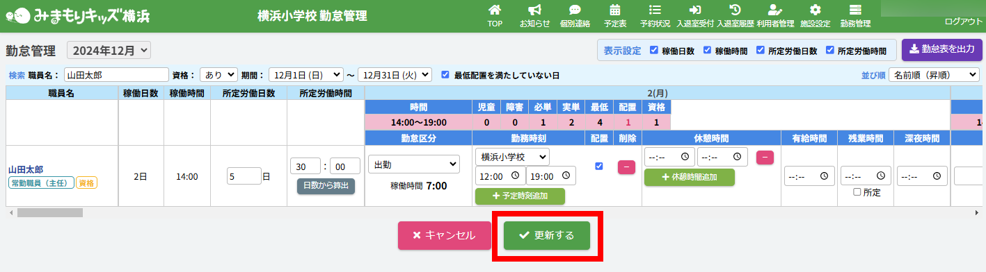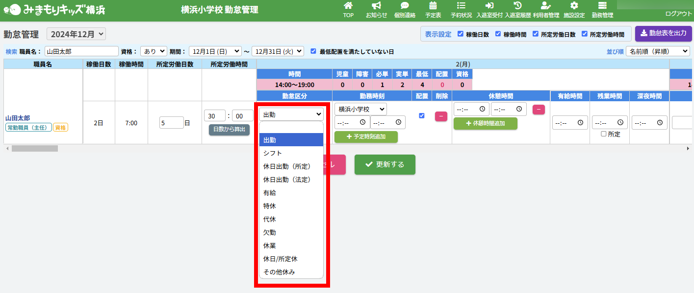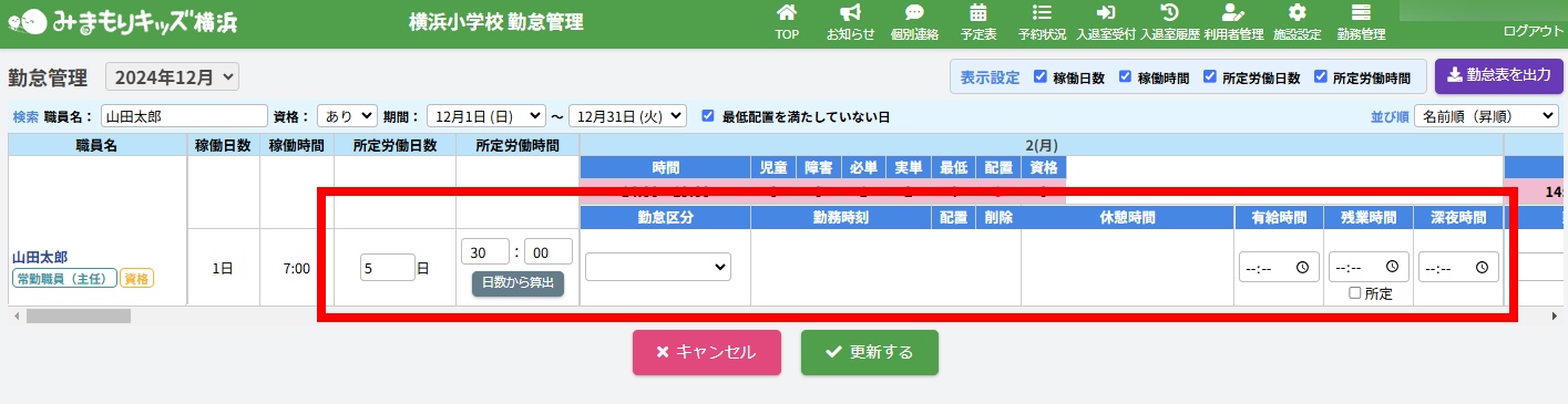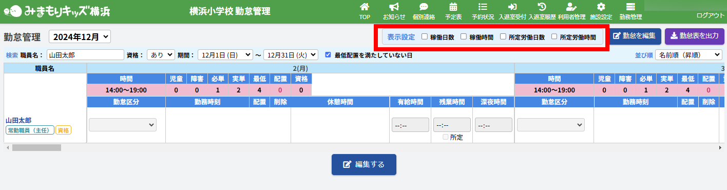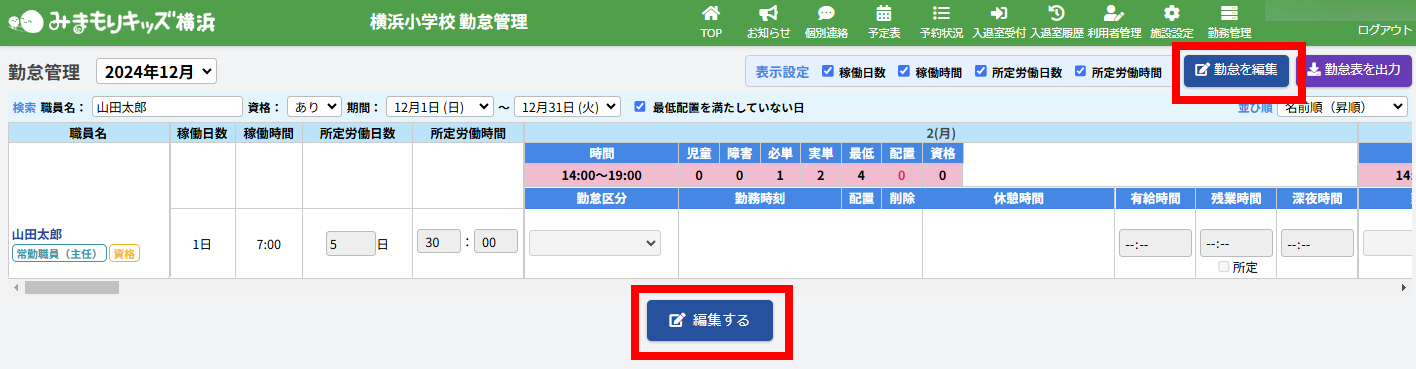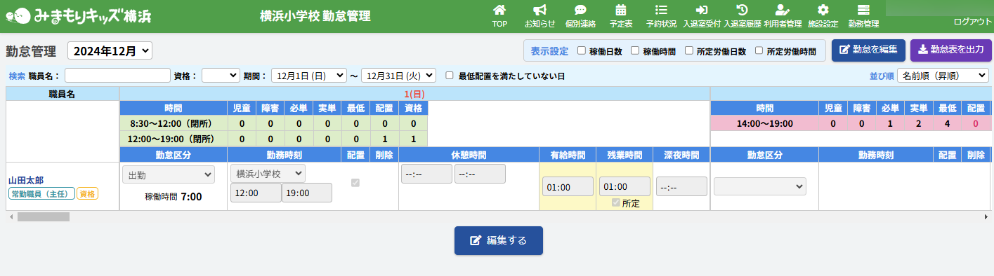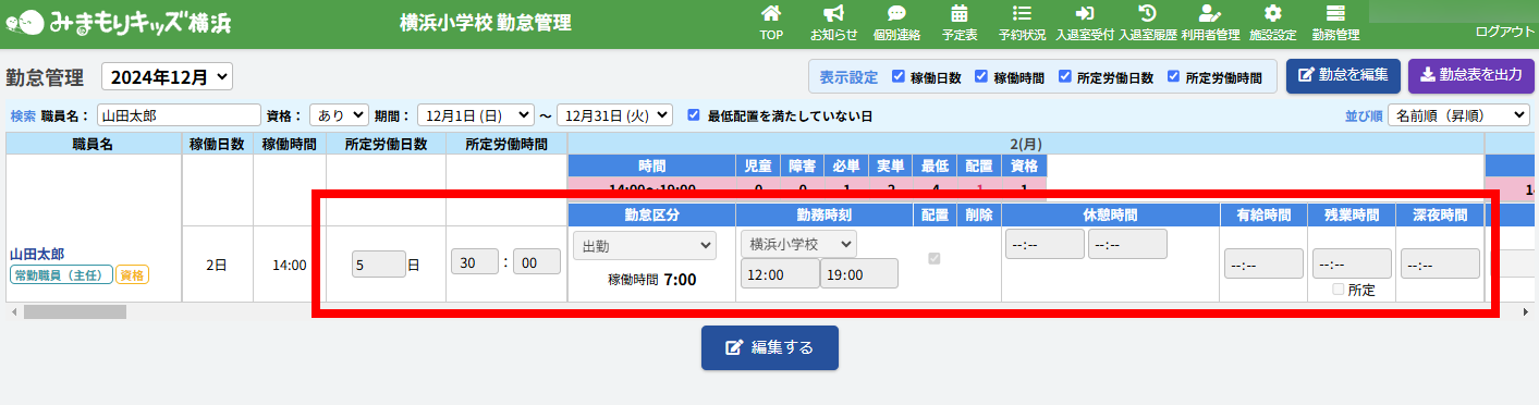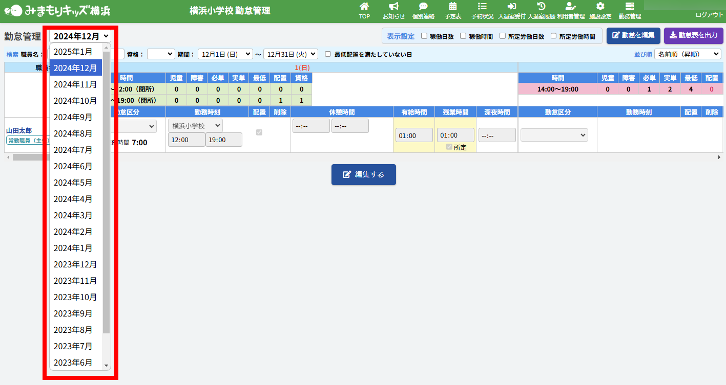 2.勤怠管理情報を編集できるようになります。編集したい職員を選択してください。