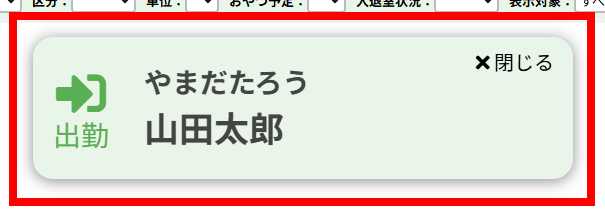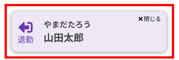 画面に読み込むと、画面に大きく職員名やその職員の出退勤時間の表示・自動記録がされます。