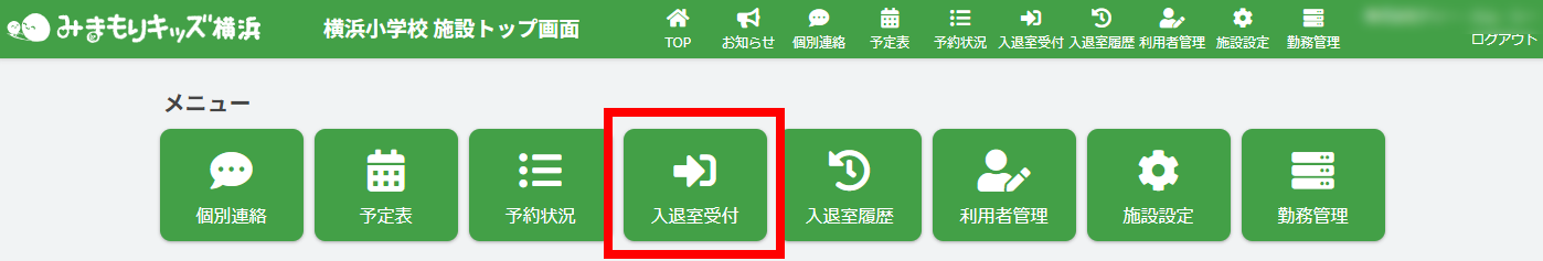 施設側施設トップ画面でメニュー【入退室受付】ボタンをクリックしてください。