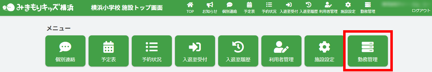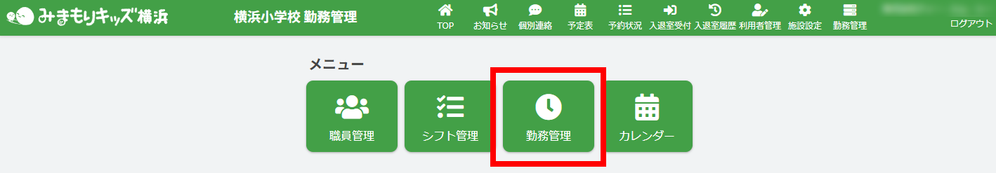 施設トップ画面メニューで【勤務管理】ボタンをクリックしてください。